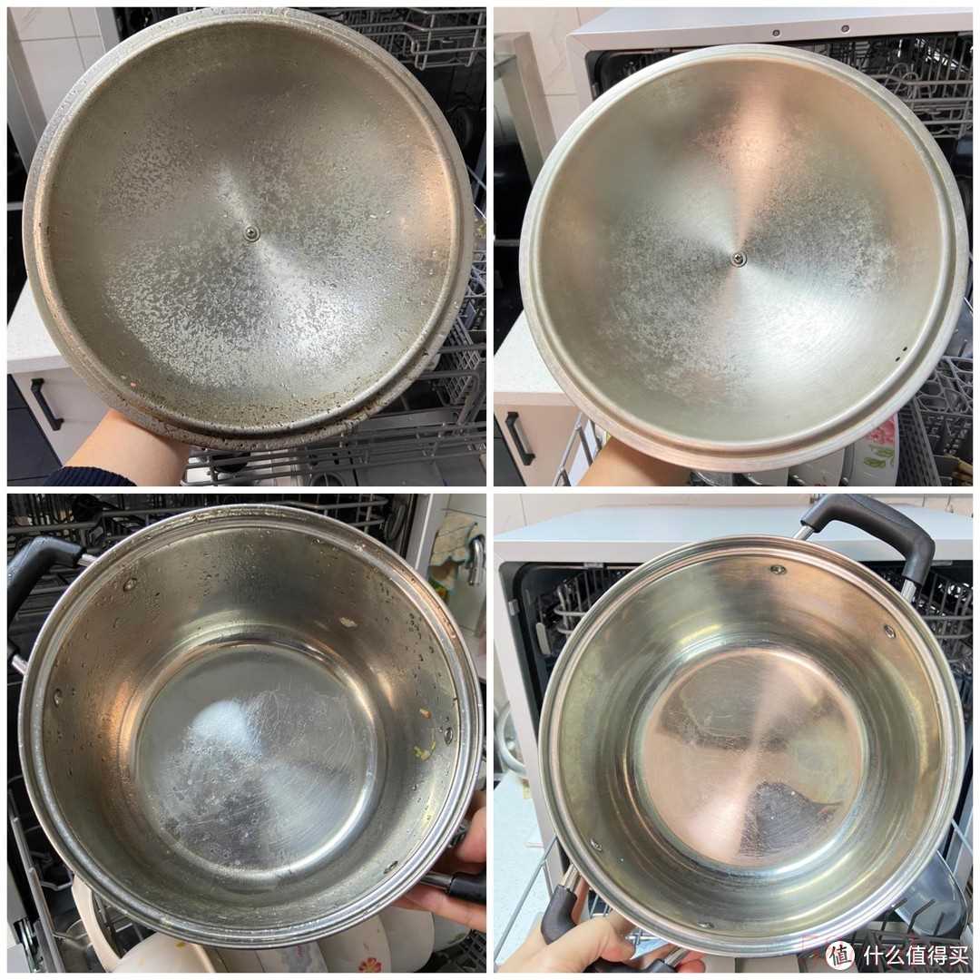 再看看锅具,可以看到锅体内部已经焕然一新,锅盖上厚厚的油污也清洗掉很多,只有很少的一些了,毕竟我使用的是快洗模式,如果使用精洗程序应该就可以彻底洗掉了。