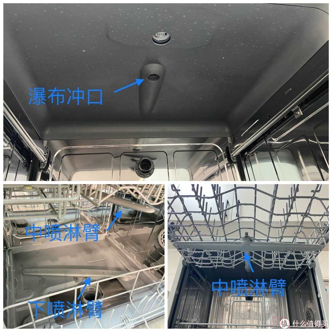 一般来说10套容量的洗碗机,采用上瀑布冲洗+中下两个喷淋臂,基本做到了上中下全覆盖,而且喷淋孔也比较多、角度覆盖也挺全的。