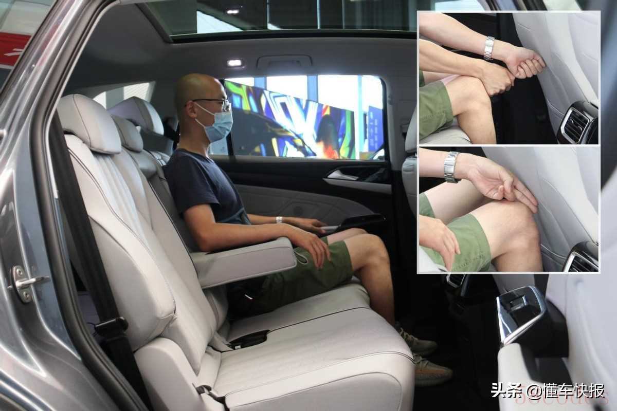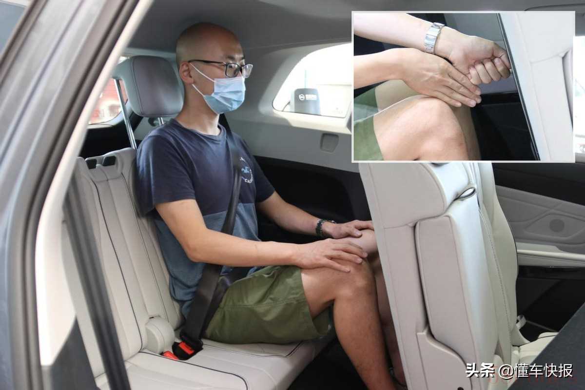 从入门版到次顶配都是2+3+2的7座布局,第二排座椅靠背和前后调节范围都比较大。将第二排座椅推到最后,身高176厘米的体验者有两拳腿部空间,还是比较宽敞的;将座椅推到最前,腿部还剩两指空间。