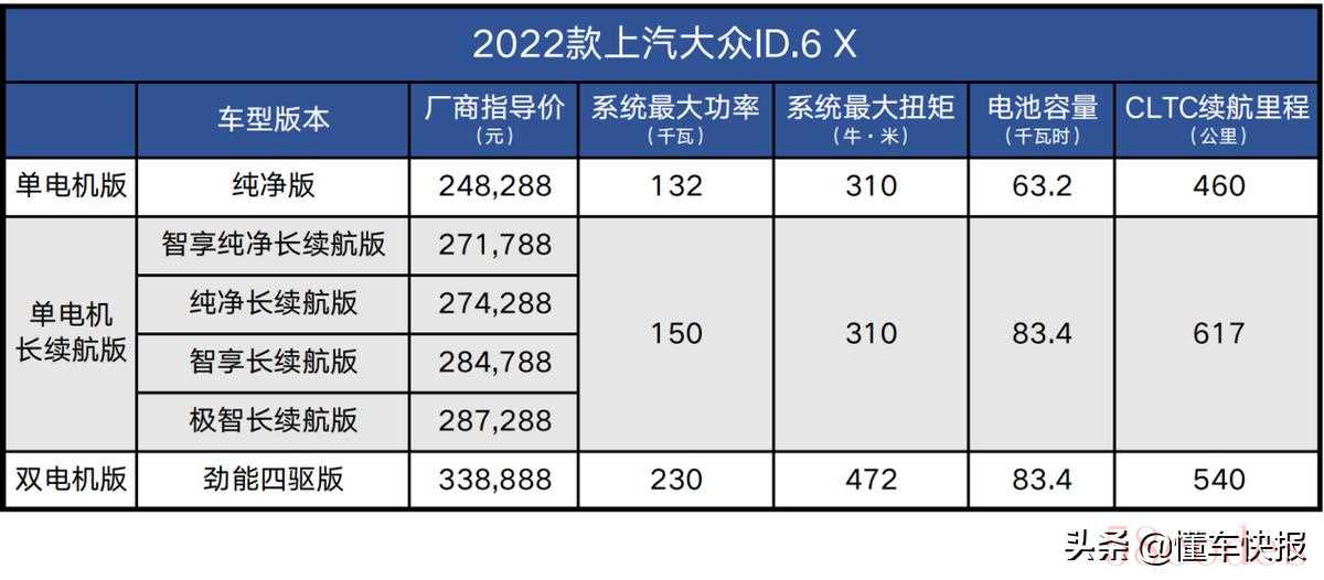 2022款ID.6 X有6款车型,按照动力和续航可以分为单电机版、单电机长续航版和双电机四驱版本。