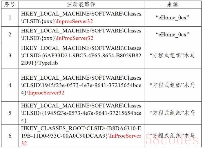 “eHome_0cx”的部分驻留文件通过修改注册表InprocServer32键值的方式,劫持了系统正常服务,在系统正常程序启动前加载实现自启动。注册表修改位置与NSA“方程式组织”所使用网攻武器相同,均位于HKEY_LOCAL_MACHINESOFTWAREClassesCLSID下随机ID项的InProcServer32子项。