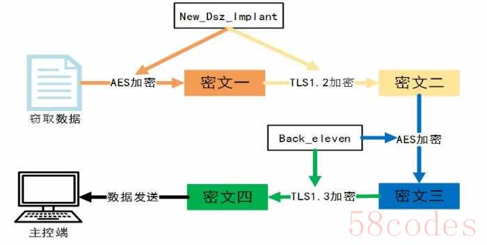 攻击者使用的3款网攻武器均采用2层加密方式,外层使用TLS协议加密,内层使用RSA+AES方式进行密钥协商和加密,在窃密数据传输、功能模块下发等关键阶段,各武器的相互配合实现了4层嵌套加密。此种多层嵌套数据加密模式与相比于“NOPEN”使用的RSA+RC6加密模式有了明显升级。