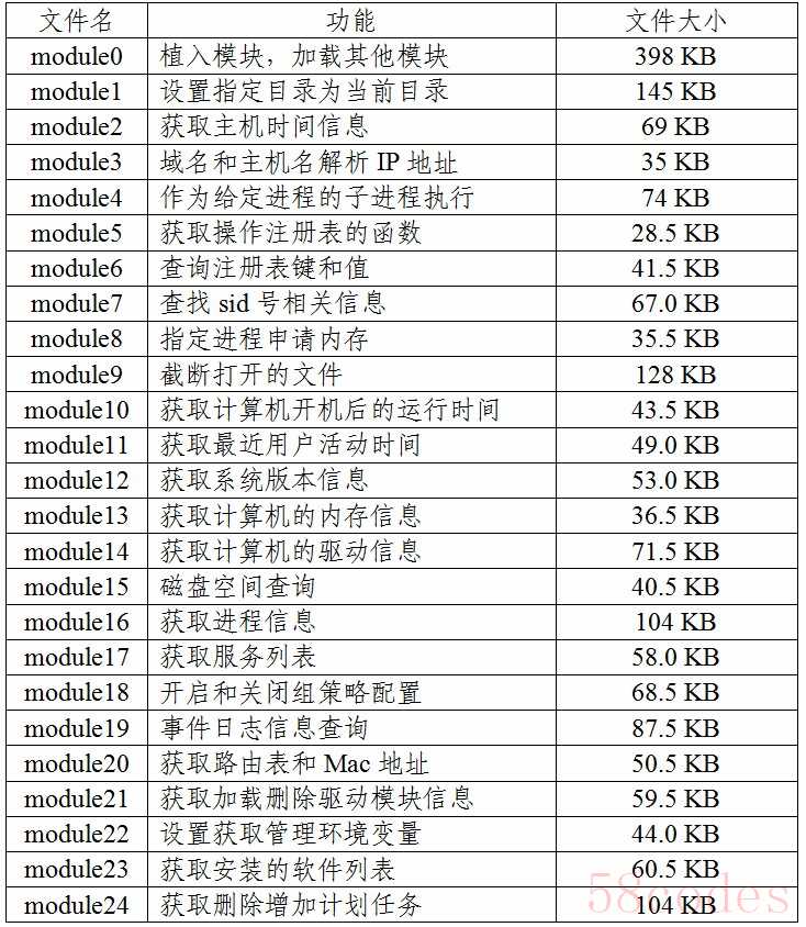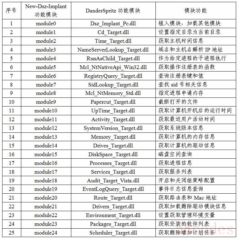 “New-Dsz-Implant”由“eHome_0cx”加载运行,在攻击活动中配合“Back_Eleven”所搭建的数据传输链路使用。其自身无具体窃密功能,需通过接收主控端指令加载功能模块,实现各项窃密功能。本次网攻事件中,攻击者使用“New-Dsz-Implant”加载了25个功能模块,各模块功能情况如下表所示。