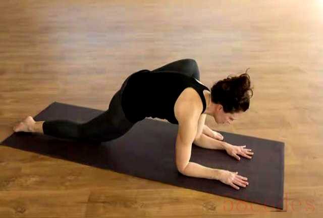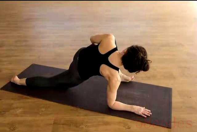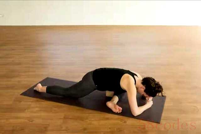一条腿屈膝打开,另一条腿跪地支撑,身体俯下去尽量贴近床面。
