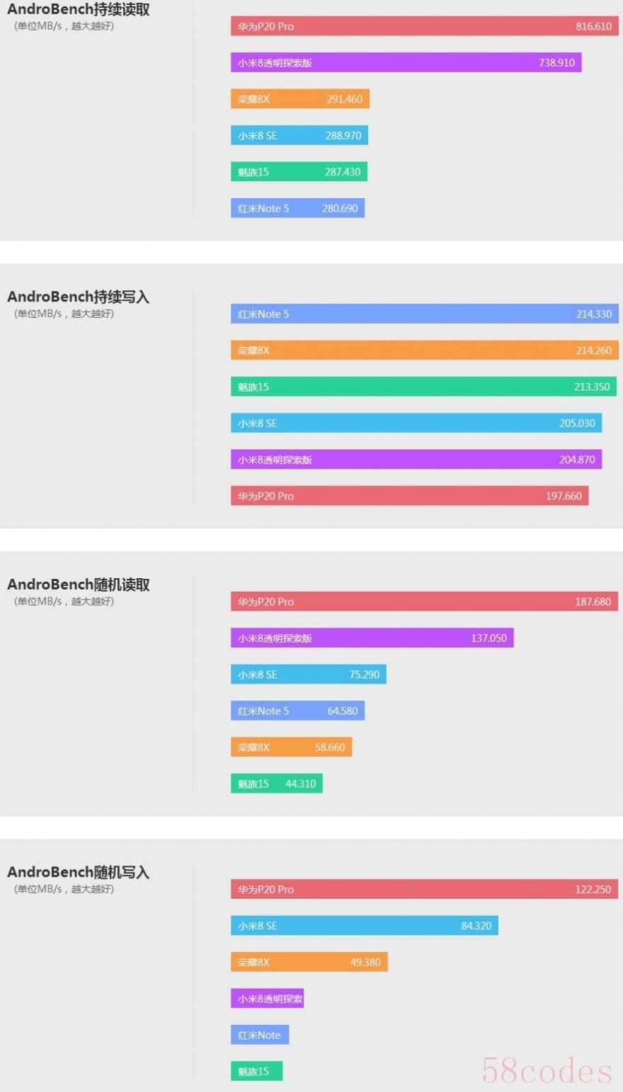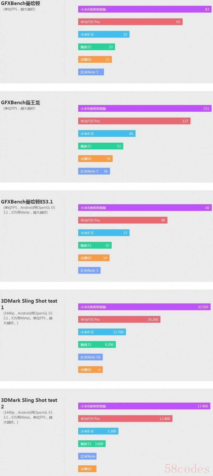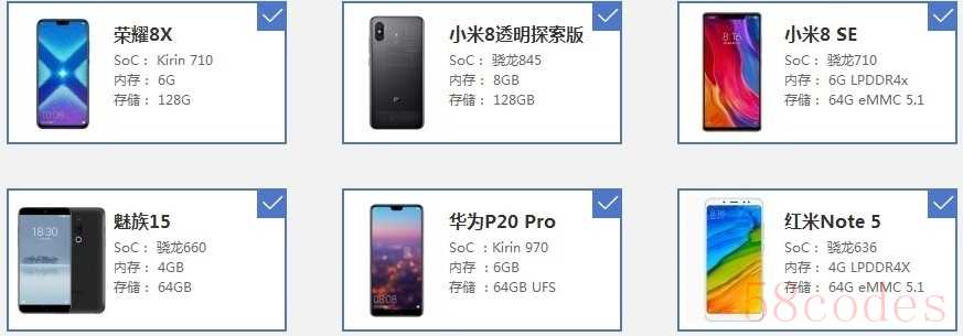 这次使用 红米Note 5 作为 骁龙636 代表,魅族15 作为 骁龙660 代表,小米8 SE 作为 骁龙710 代表,高端的 华为P20 Pro 的 Kirin 970 和 小米8透明探索版 上的 骁龙845 作为参考值出场。