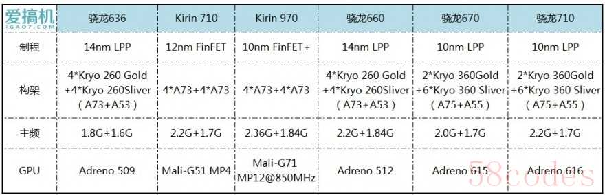 Kirin 710、Kirin 970与骁龙636、骁龙660/670、骁龙710参数对比