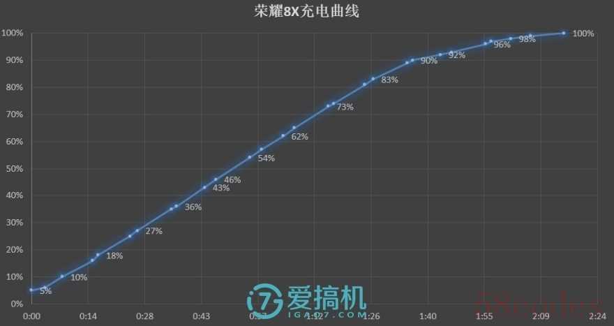 荣耀8X不支持快充,标配5V2A充电器,而且也只能5V2A充电。从5%-100%充电,15分钟充到16%,30分钟充到31%,在45分钟充到45%,1小时充到58%,充饱共耗时2小时15分,几乎是每分钟1%的速度充,充电速度明显偏慢。在同级甚至更低级对手都支持快充的年代,这个充电速度确实是比较明显的短板。