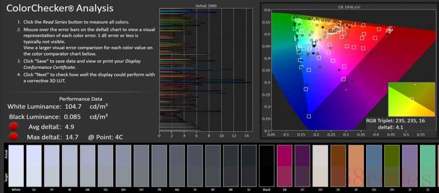 - P3色域下,104色平均deltaE为5.3,最大14.1,表现同样中规中矩。
