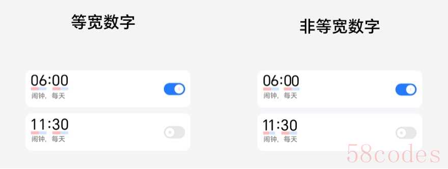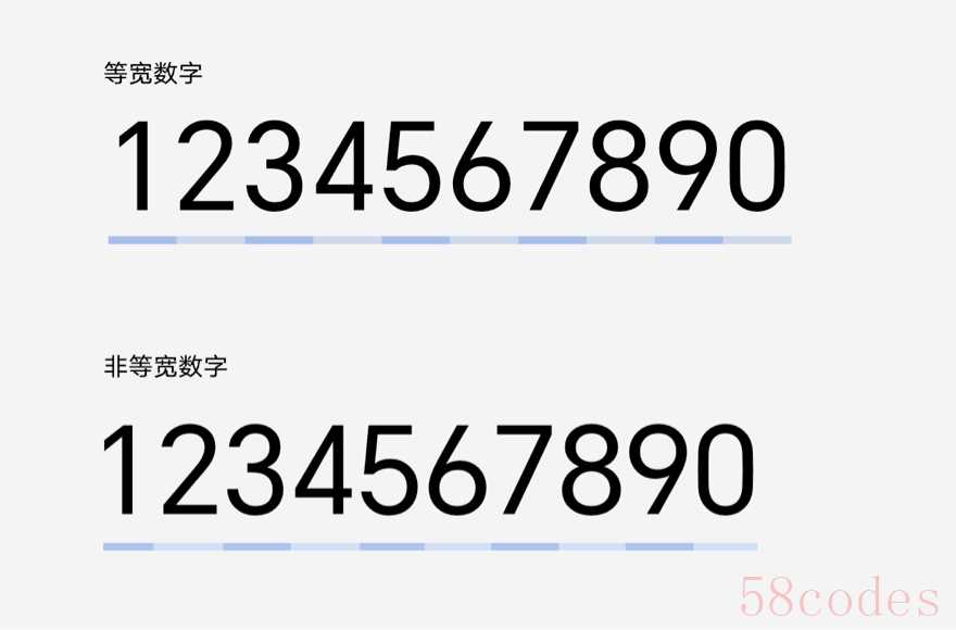 - 支持等宽数字和非等宽数字,等宽数字适用于数据实时刷新、布局固定的数字场景,以及有排版左右对齐需求的场景。而有些场景需要单独调用非等宽字体,比如宽度有限,易截断的数字、排版居中对齐场景。
