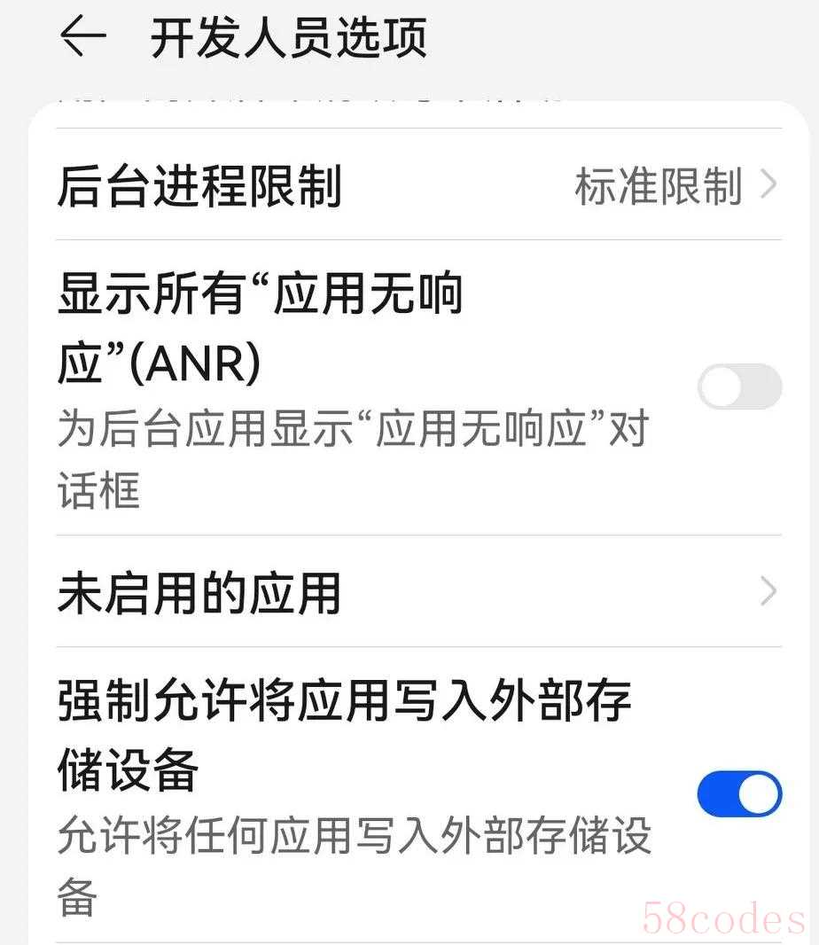 2、进入“开发人员选项”,打开“强制允许将应用写入外部存储设备”。
