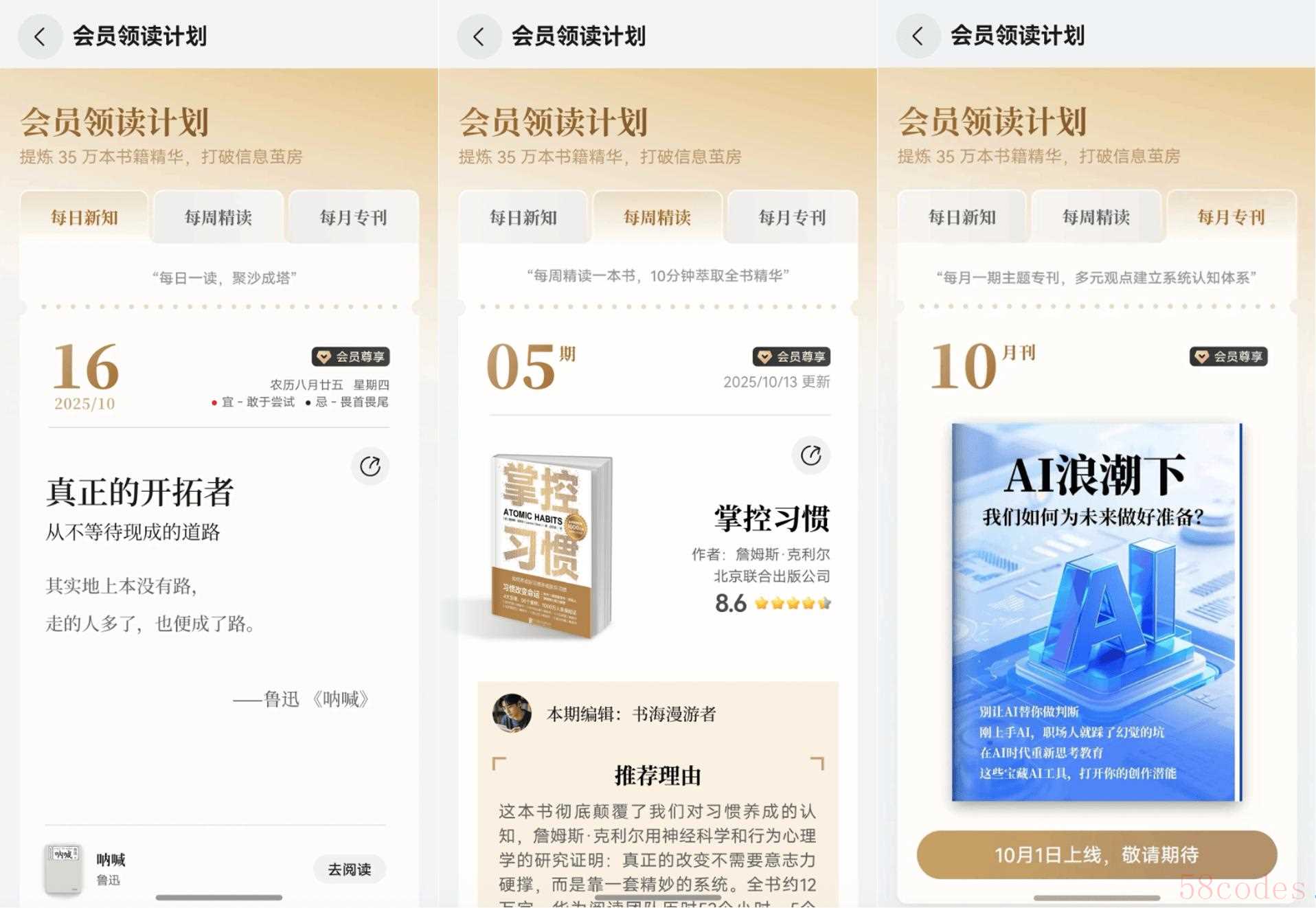 会员权益升级新增的书单,不仅包含广受追捧的《生命简史》、《影响力法则》、《昆虫记》、《瓦尔登湖》等热门佳作,更收录了如“宋词三百首”、“莎士比亚少年版”这样的文学经典,覆盖了热门小说、人物传记、人文社科、专业书籍、亲子育儿等众多品类,从内容的深度、广度与品质上为用户“读好书”提供了坚实保障。推出会员领读计划等多项会员活动,全域赋能深度阅读华为阅读还带来一系列VIP会员体验优化,让阅读价值更加显性化。华为阅读结合当下热点持续为用户带来优质书单,近日贴合热点上线的“故宫博物院建院100周年”书单、“诺贝尔文学奖”书单广受读者好评;“好书5分钟”视频讲书栏目更是为用户提供了多元化的知识吸收方式;“会员领读计划”通过资深编辑严选优质书籍,每日、每周、每月都有精选内容为华为阅读会员做专属推荐,带来精品阅读体验。