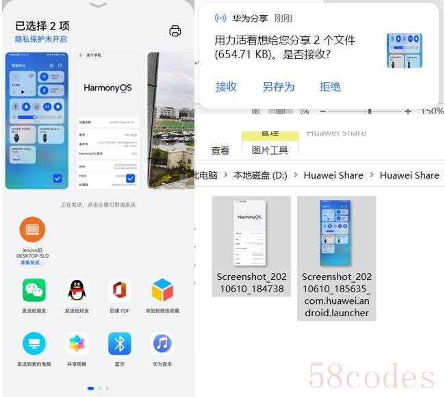 1. 手机向电脑端分享:选中要分享的图片或文件点分享即可,文件默认保存在 D:Huawei Share 内。如下图所示。