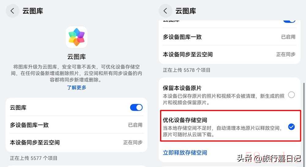 有了这200G的“云端大仓库”,我立刻就把华为云空间里的“云图库”功能给打开了,并且开启了“优化设备存储空间”这个选项。
