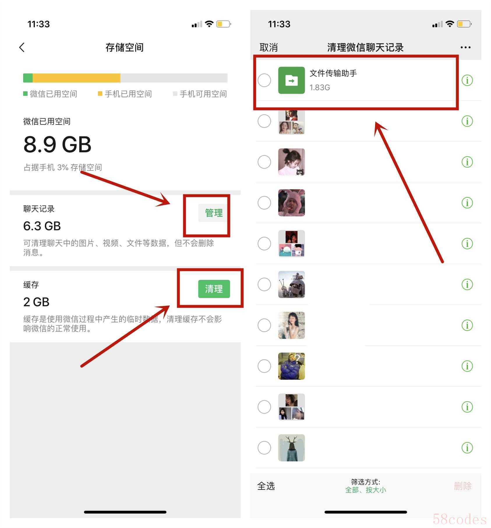 点击聊天记录清理或者缓存清理,都能帮你清理好几个G的空间。