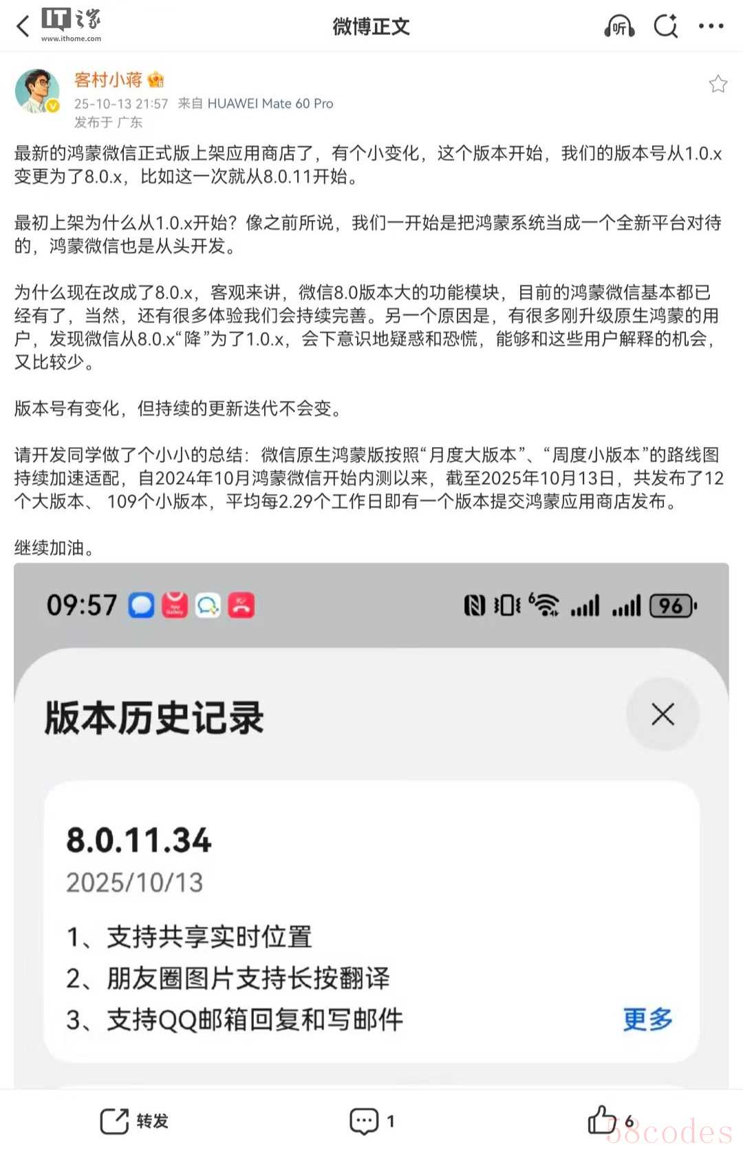 根据微信员工 @客村小蒋 的说法,版本号有变化,但持续更新迭代不会变。微信原生鸿蒙版按照“月度大版本”、“周度小版本”的路线图持续加速适配。