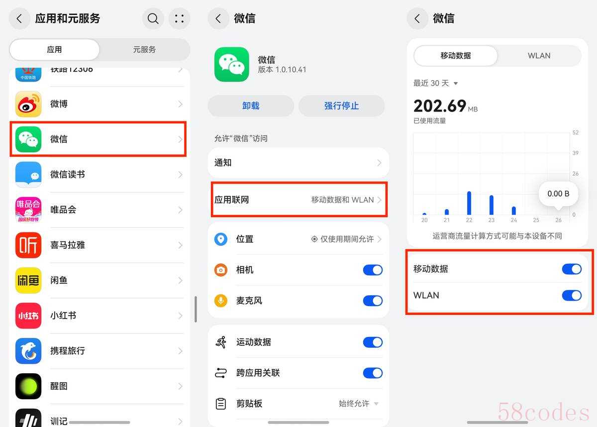 然后再从设置进入“应用和元服务”,找到微信,进入应用联网,打开“移动数据”和“WLAN”,想收消息总得先联网吧!