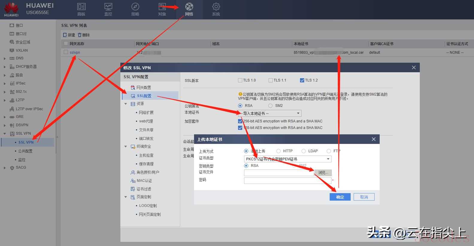 - 打开SSL VPN的管理界面,按照箭头的方向点按钮,选中上传后,点选上传上来的证书就算完成