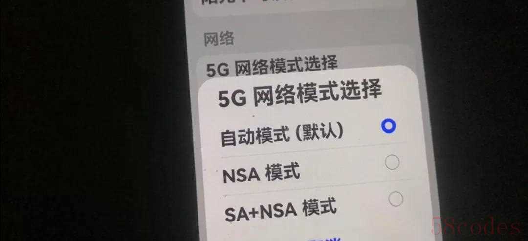 看下方出现了一个“5G网络模式选择”,我们要把它打开。打开之后在这里就看到有三种模式了:一个是自动模式,一个是NSA模式,一种是SA加上NSA模式。