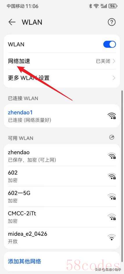 2、进入到WLAN页面,点击“网络加速”。