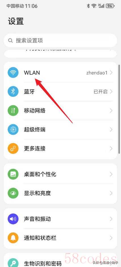 1、打开华为手机后,进入到设置页面,点击“WLAN”。
