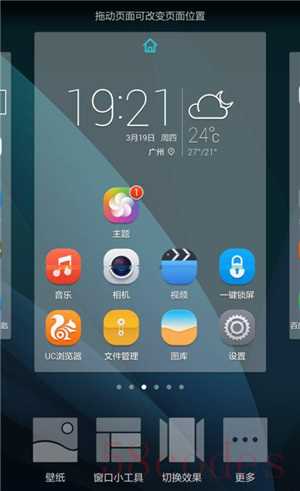 1、在屏幕上张开两个手指,进行合并滑动,进入页面切换界面,这里不是为切换主界面,而是选择【更多】;