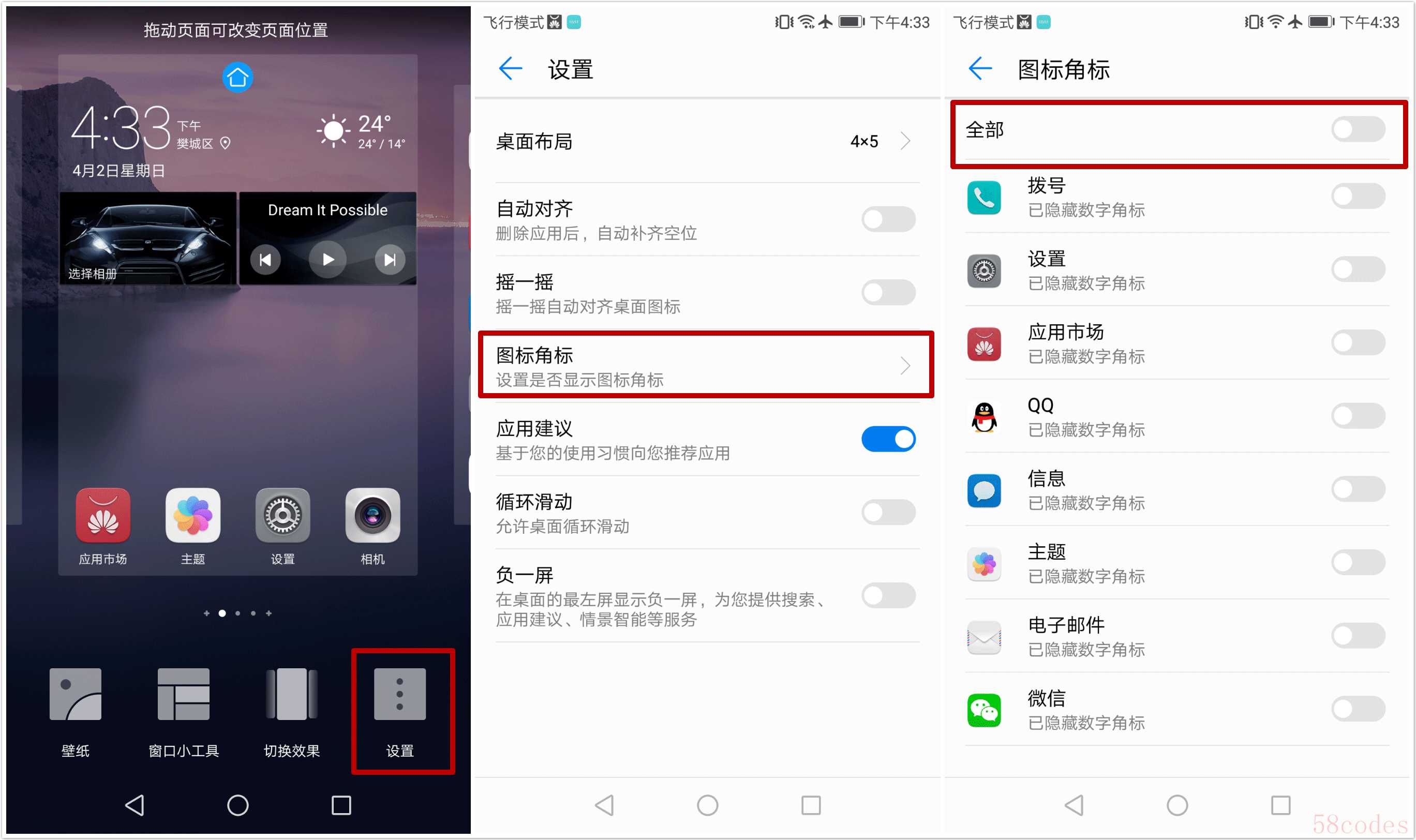 【在主屏幕是两个手指一捏】→【设置】→【图标角标】→【全部关闭或留下你需要用的就OK了】