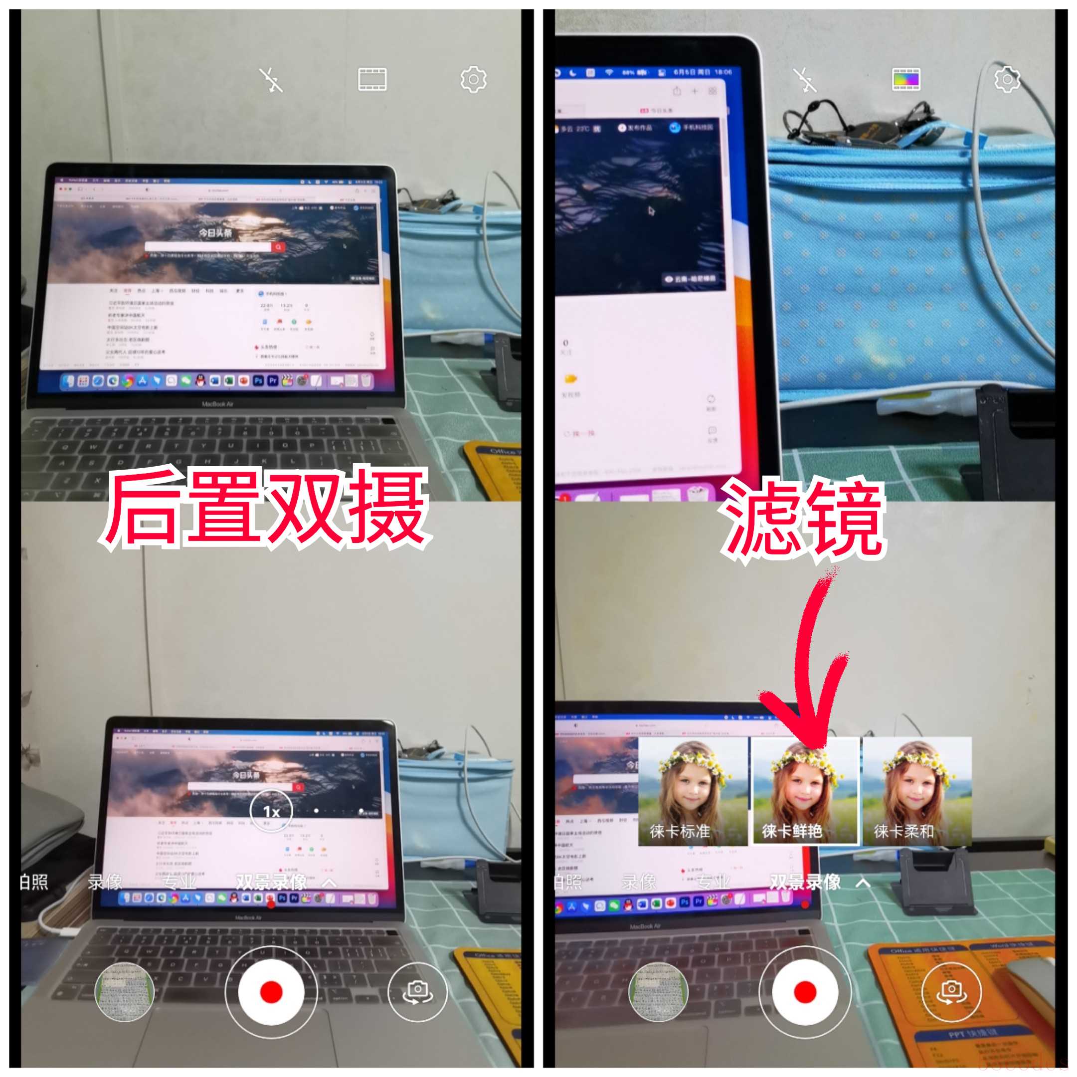 4.在分屏双景录像的时候,你还可以翻转镜头,这样上下两个画面都显示后置摄像头拍摄,不过上面的依然是主摄,支持变焦,而下面的只是普通录像,但可以使用滤镜。