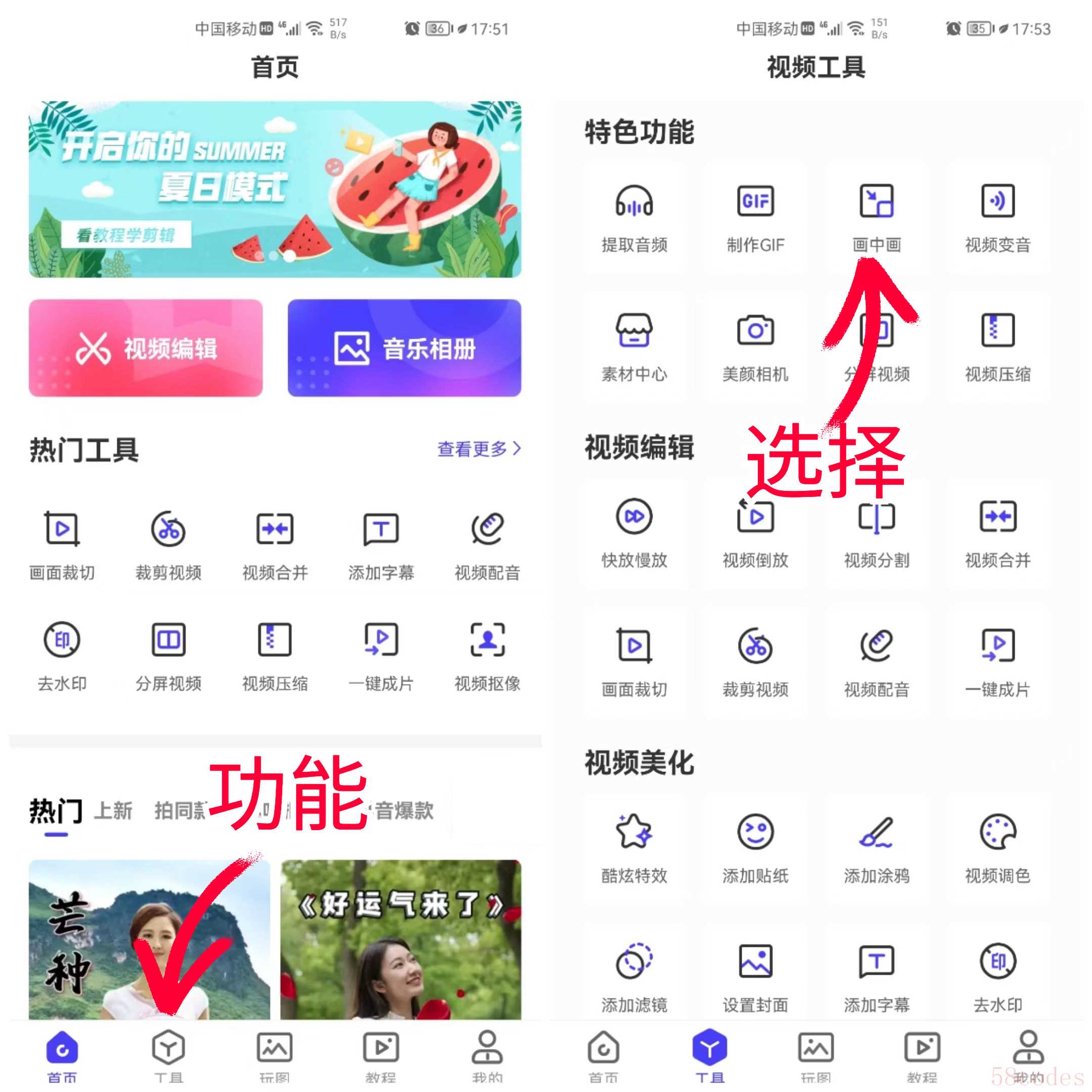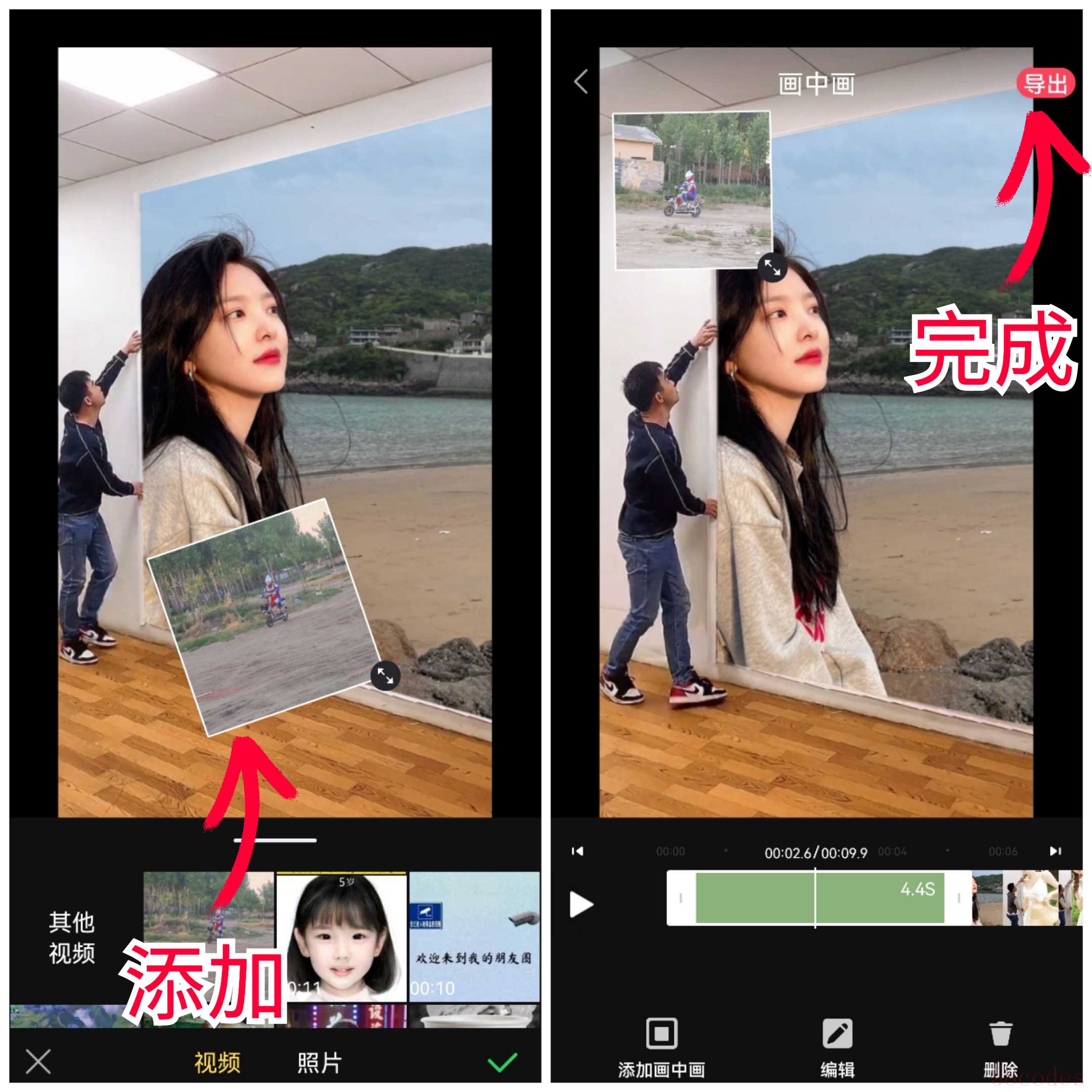 6.当然也有「画中画」功能,可以自己制作画中画视频,先添加一个视频,然后点击「添加画中画」,视频就自动叠加到第一个视频上了,最后进行编辑、导出即可。