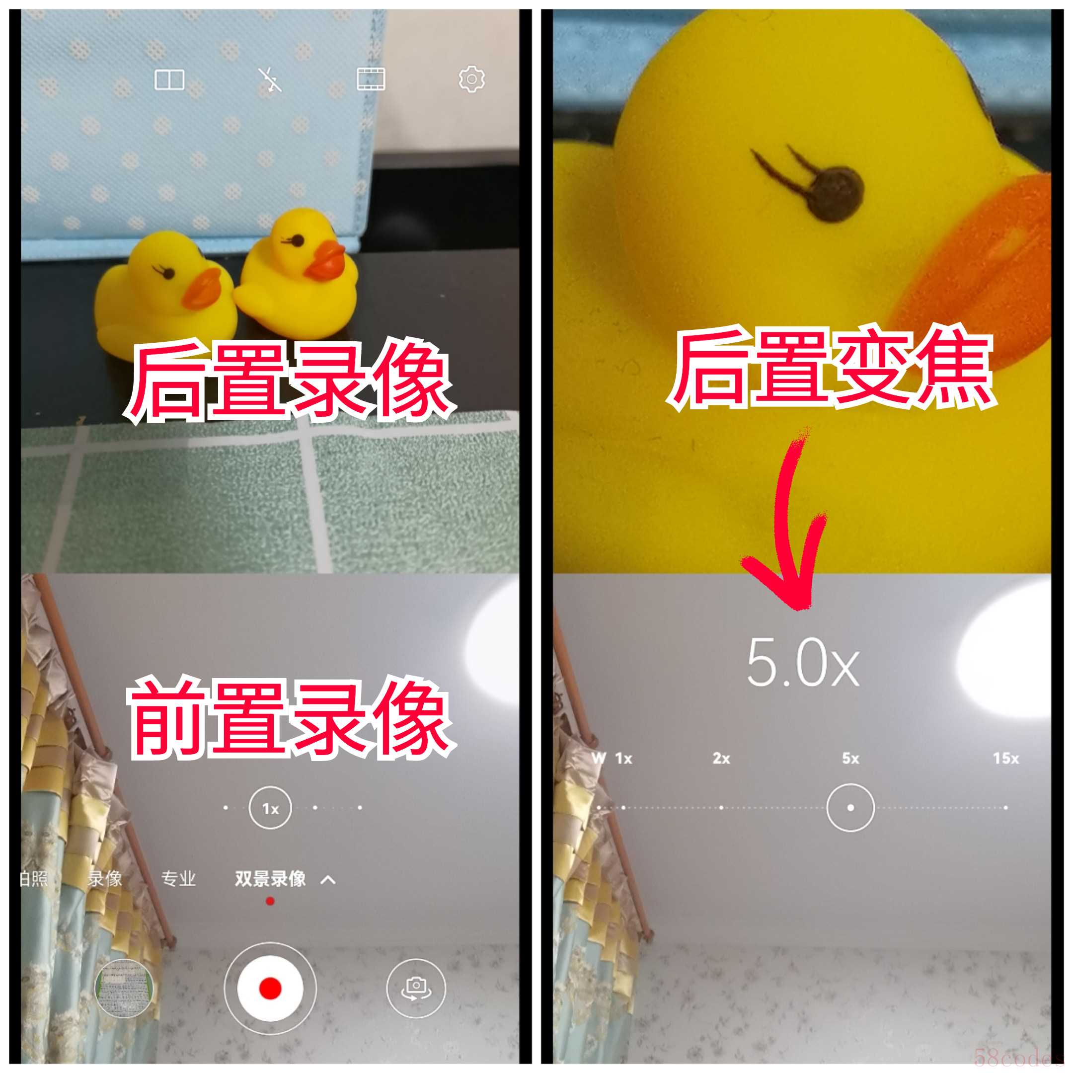 2.随后前置镜头和后置镜头同时启用了,此时屏幕分为上下两个部分,上面显示的画面是后置摄像头记录的,下面显示的画面是前置摄像头自拍的,并且后置摄像头支持变焦。
