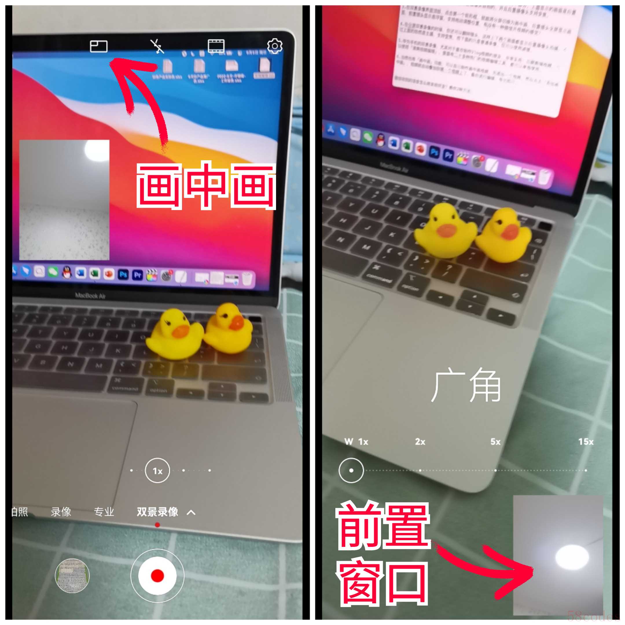 "画中画效果:" 可以将前后摄像头的画面以画中画的形式同时显示,例如后摄像头画面为主画面,前摄像头画面为小窗口显示自拍或驾驶舱视角。