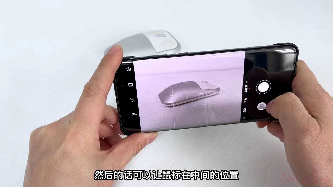 点击左侧返回以后呢,比如说我们想拍一个水平的一个照片,可以根据这个水平仪进行拍摄,我们接着把鼠标放到手机的正中间,然后的话可以让鼠标在中间的位置,大家可以通过水平仪对准拍摄。