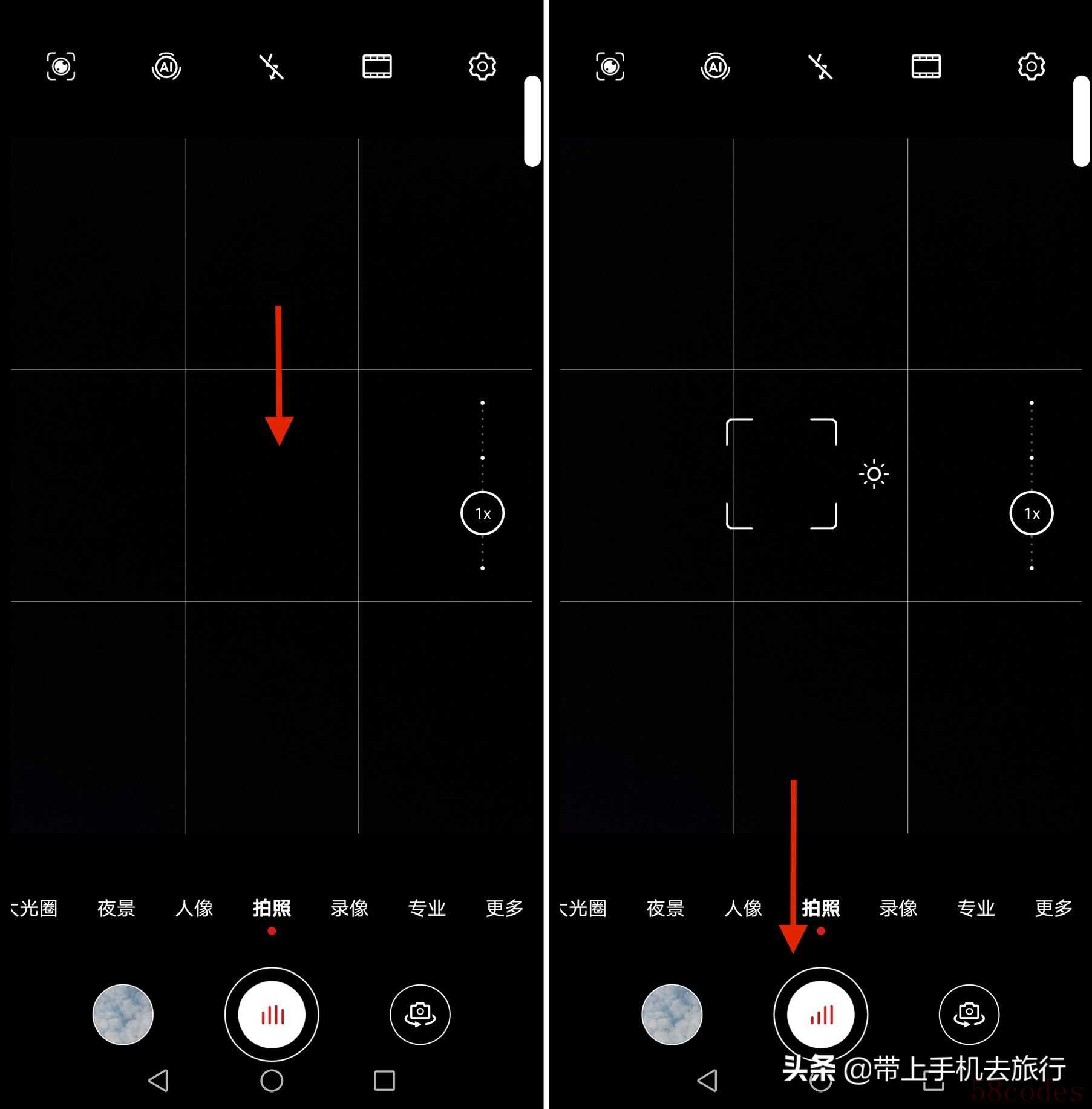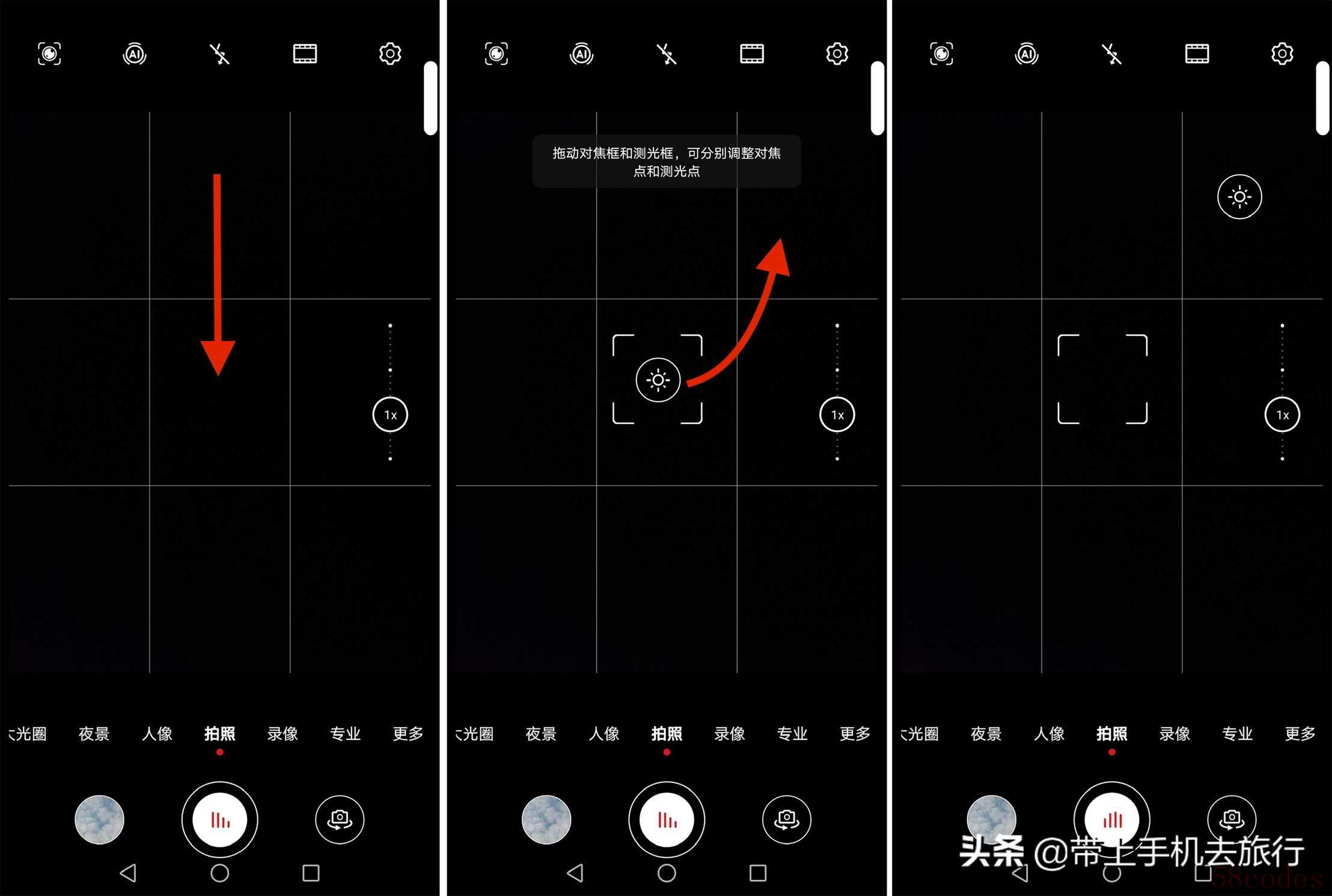 《华为手机“拍照”界面先长按被摄对象,移动(调整)测光圈到合适位置后可随时点击快门拍摄示意拼图》