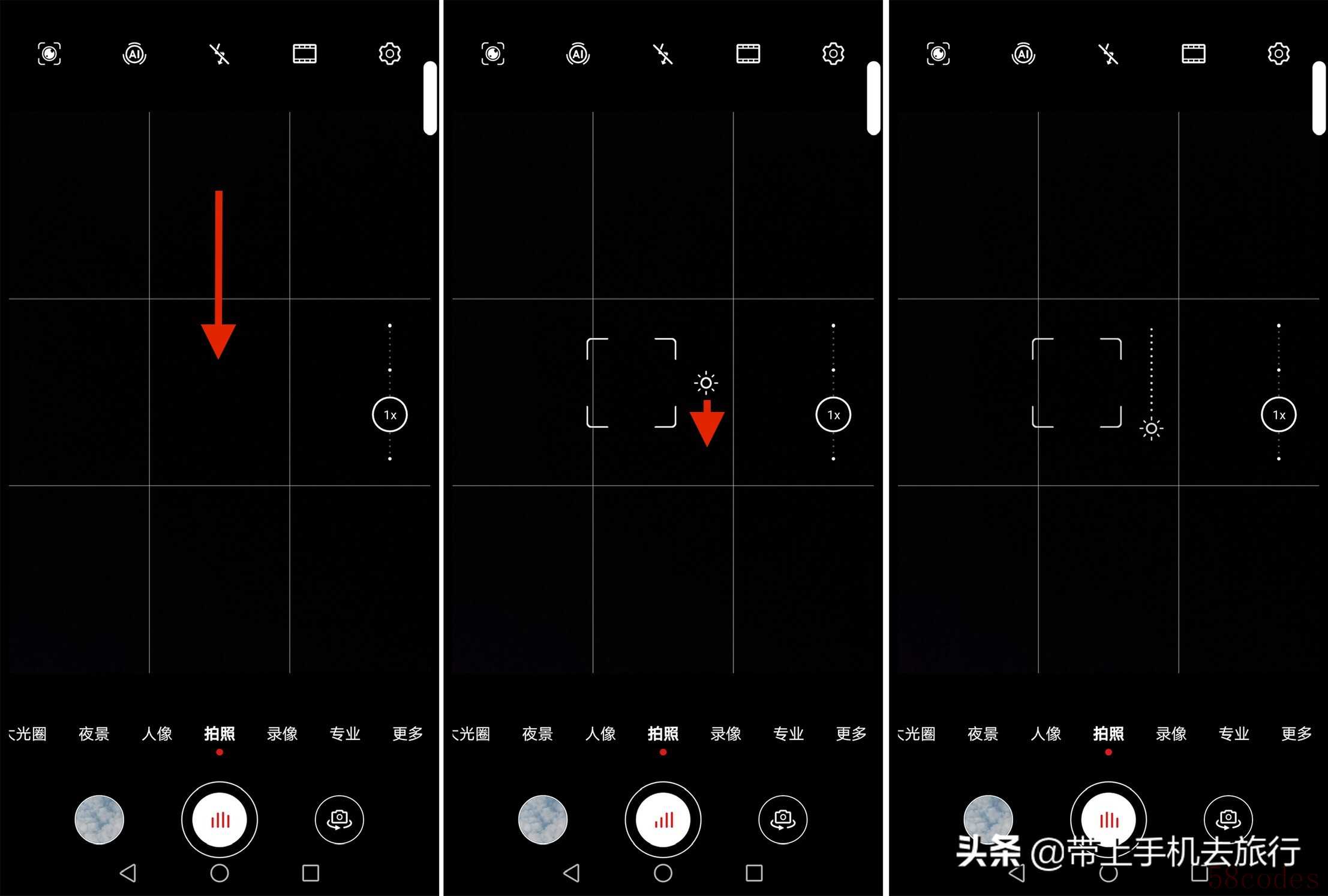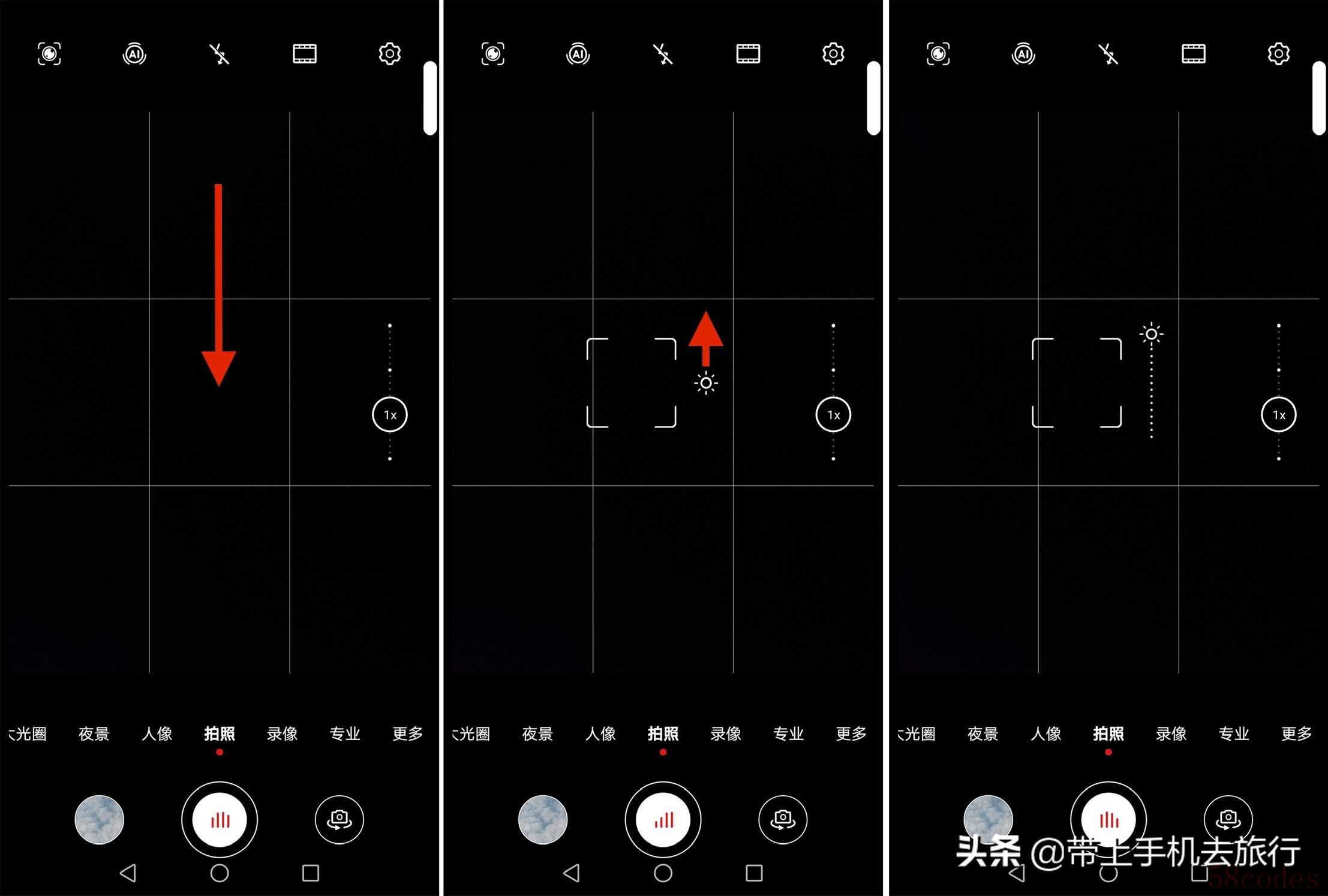 《华为手机“拍照”界面点选被摄对象,向下滑动调暗画面(曝光负补偿),可随时点击快门拍摄示意拼图》