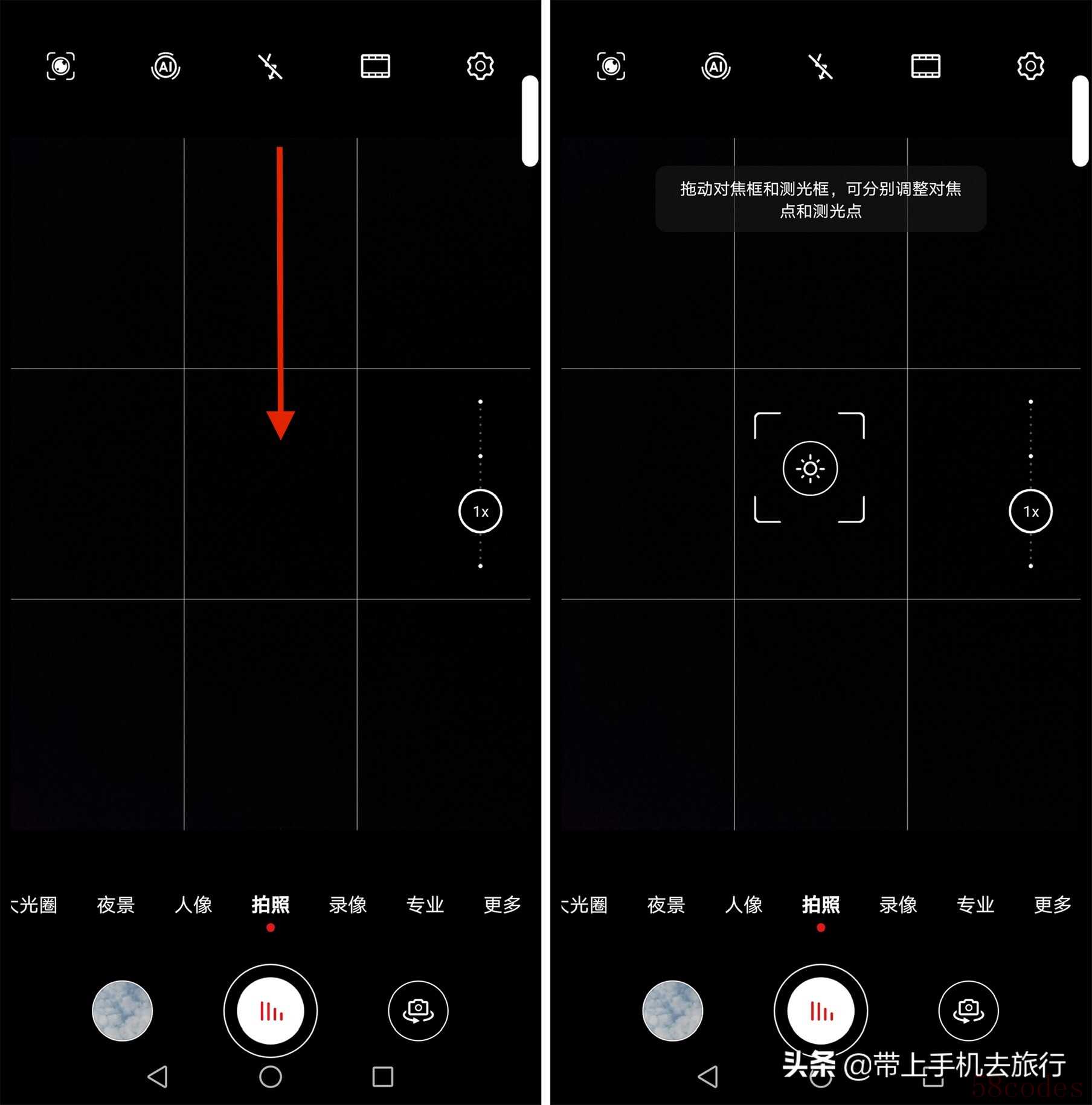 《“拍照”模式锁定对焦测光后移动测光圈到暗处界面截屏与拍摄效果(高光过曝)拼图》