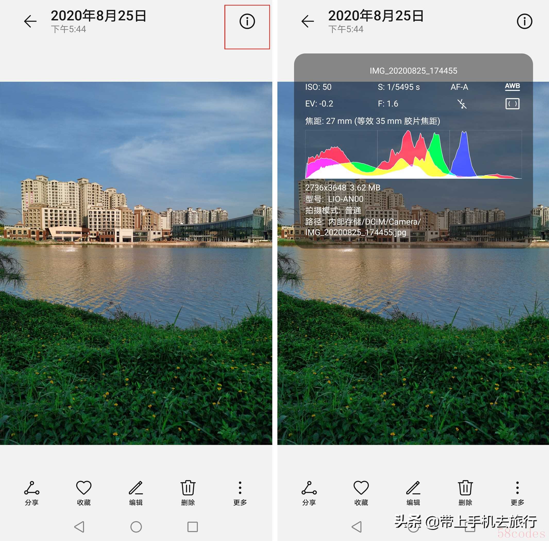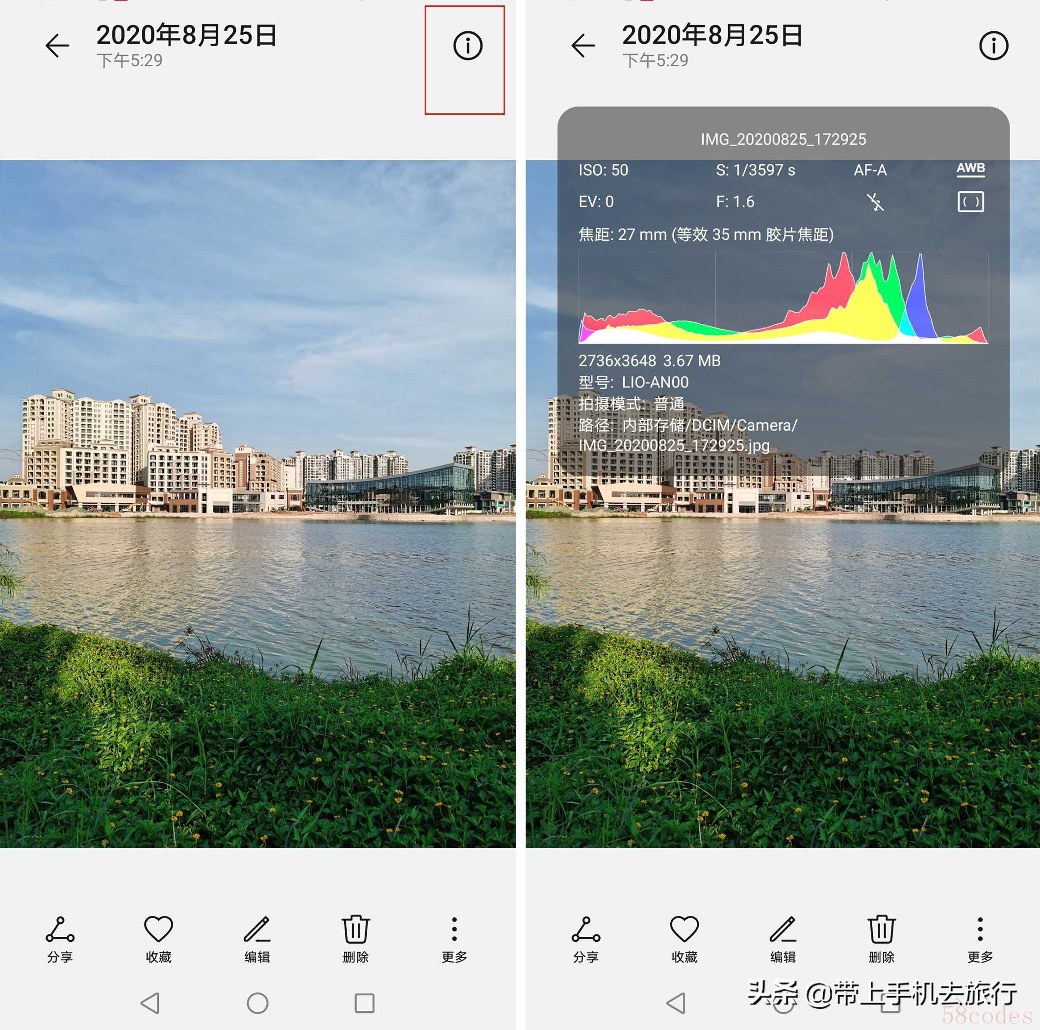 《在照片界面打开直方图路径截屏拼图》(“拍照”模式点选对焦测光点后向下滑动微减曝光量的拍摄效果)
