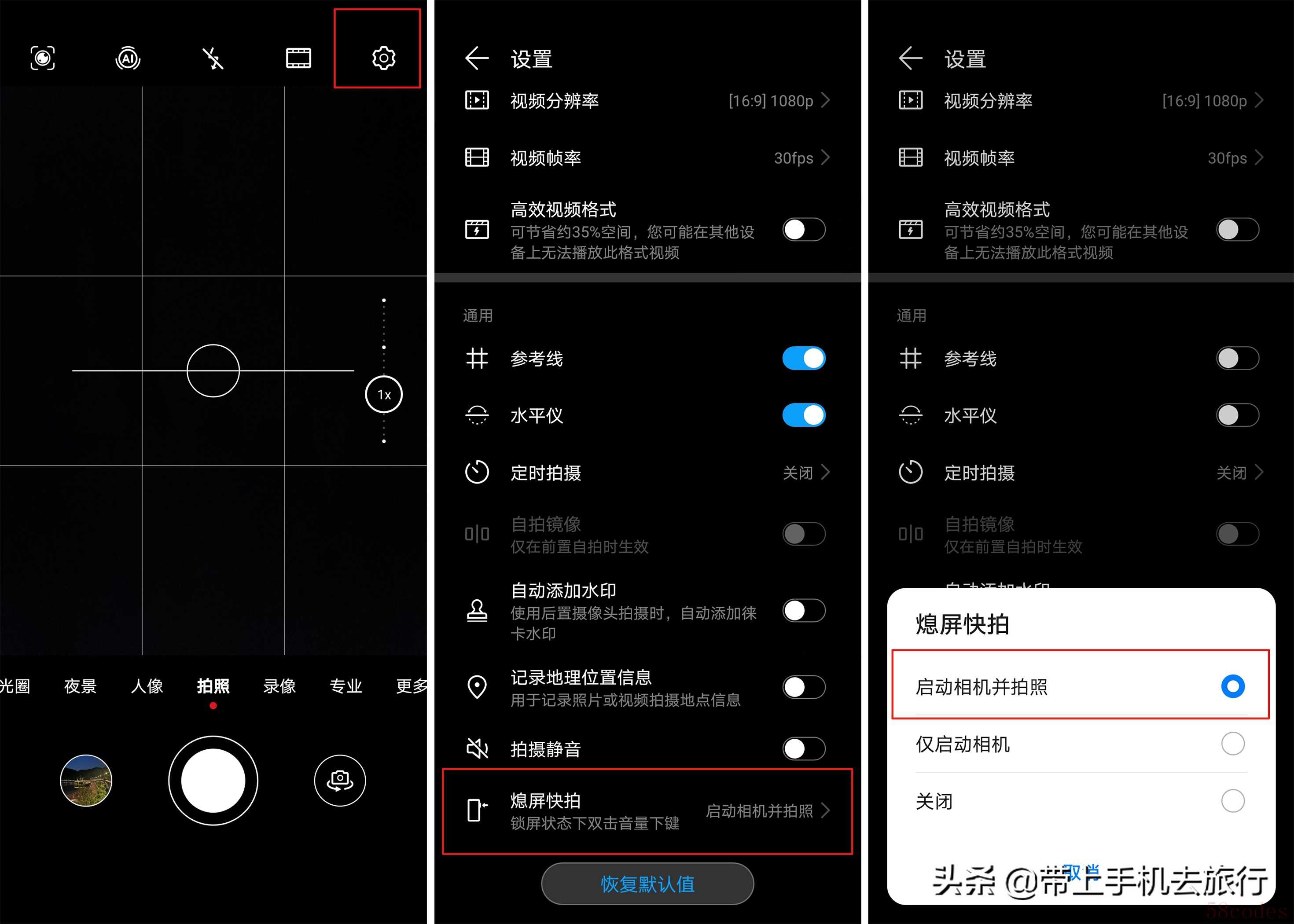 《华为手机打开“熄屏快拍”(“启动相机并拍照”)路径界面截屏拼图》