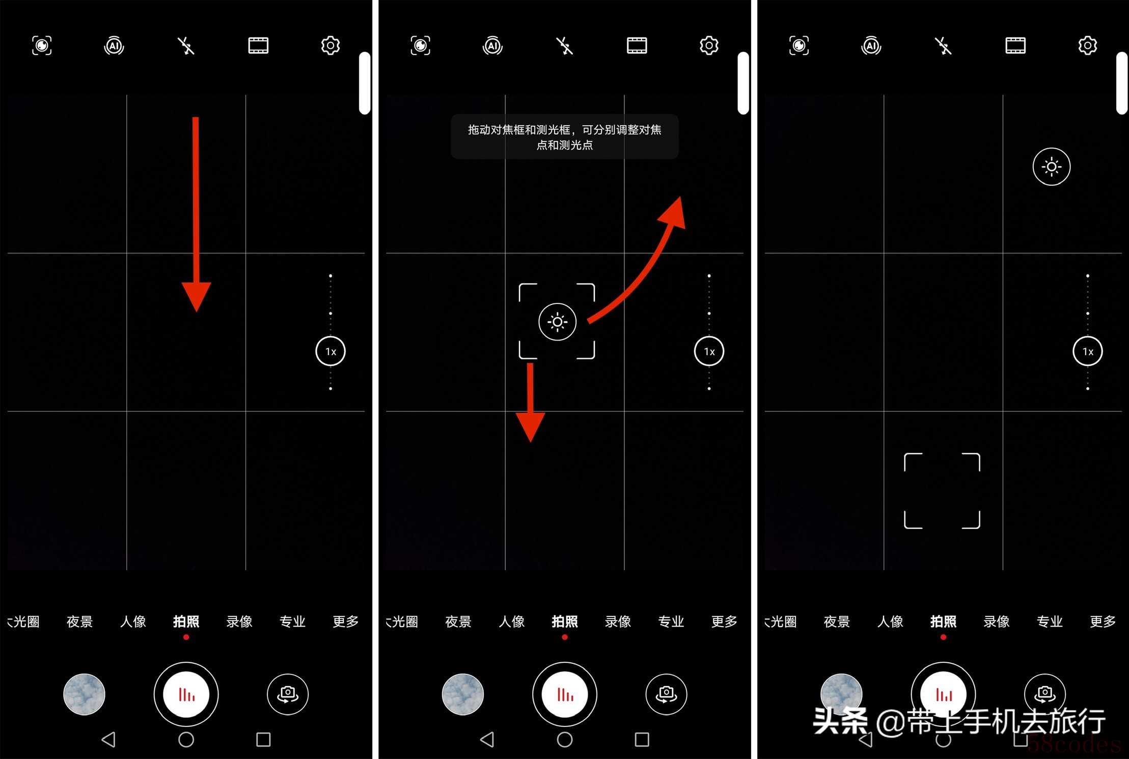 《“拍照”模式锁定对焦测光后移动测光圈到亮处界面截屏与拍摄效果(曝光合适)拼图》