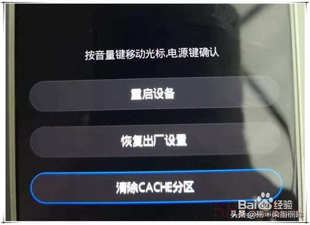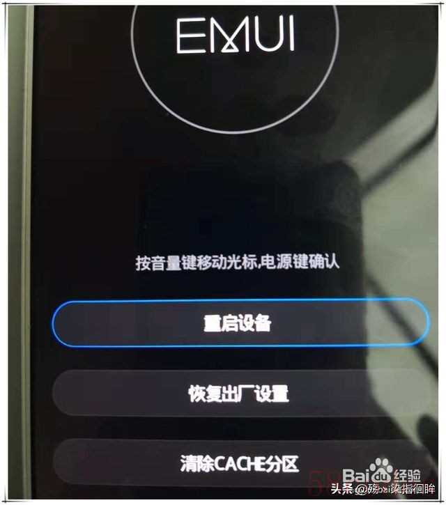 华为手机双清步骤二:在recovery 界面,一般有三个选项,分别是“重启设备”、“恢复出厂设置”、“清除CACHE分区”,其中后两项就是我们要操作的双清。