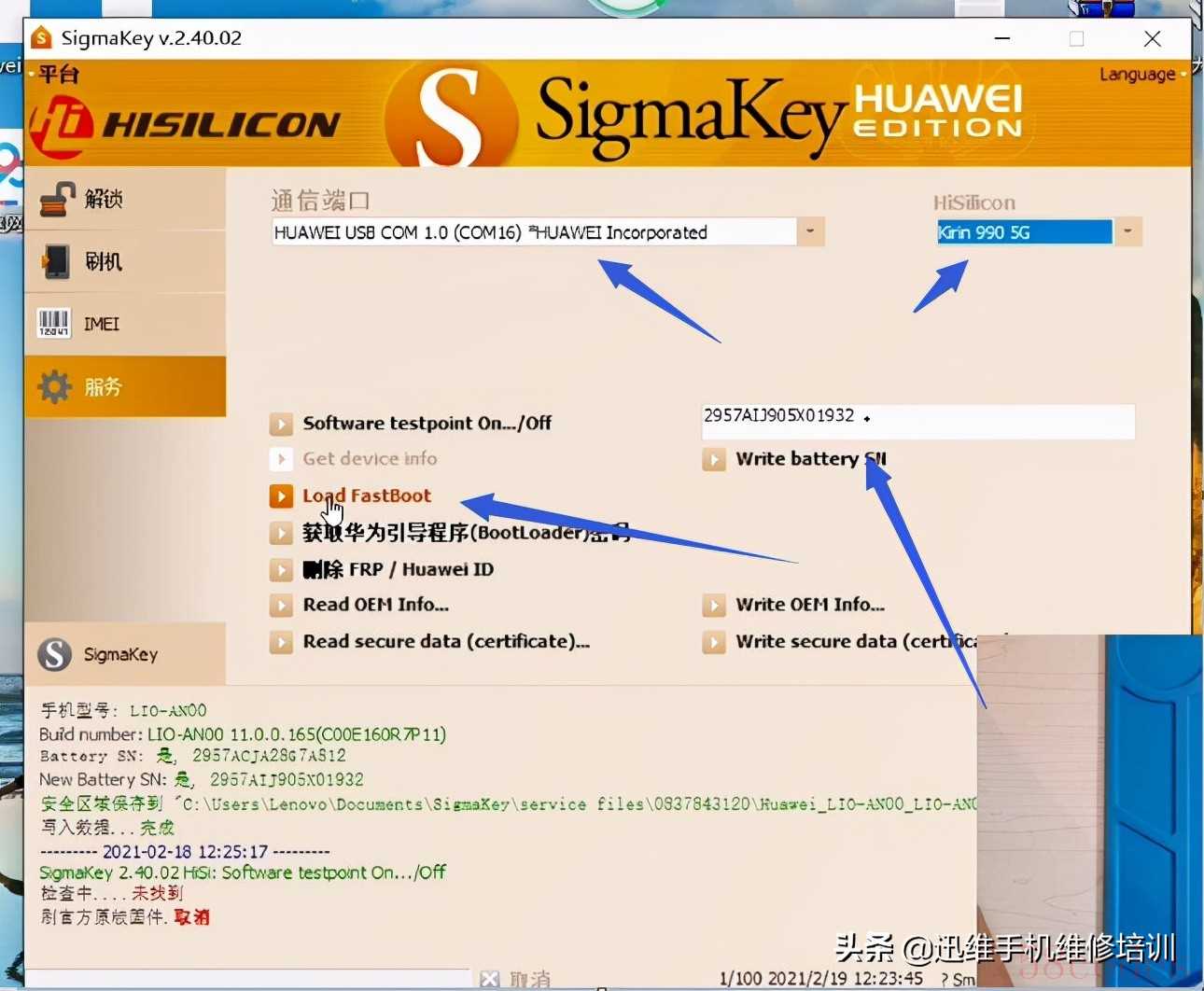 具体操作步骤:把电池扣到主板上,拆下摄像头,用镊子把图中这个点接地短接,不放手然后插线连上电脑,打开电脑的设备管理,找到huawei USB COM1.0这个端口,打开软件选择端口,选择CPU的型号,点写入底层资料。