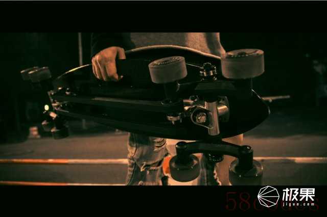 相比其他滑板底部多了4个轮子和一条龙骨,也正是多出来的部件使其具有下台阶的功能。八个轮子采用的都是60mm氨基甲酸乙酯超高弹轮胎,看起来应该很耐躁。