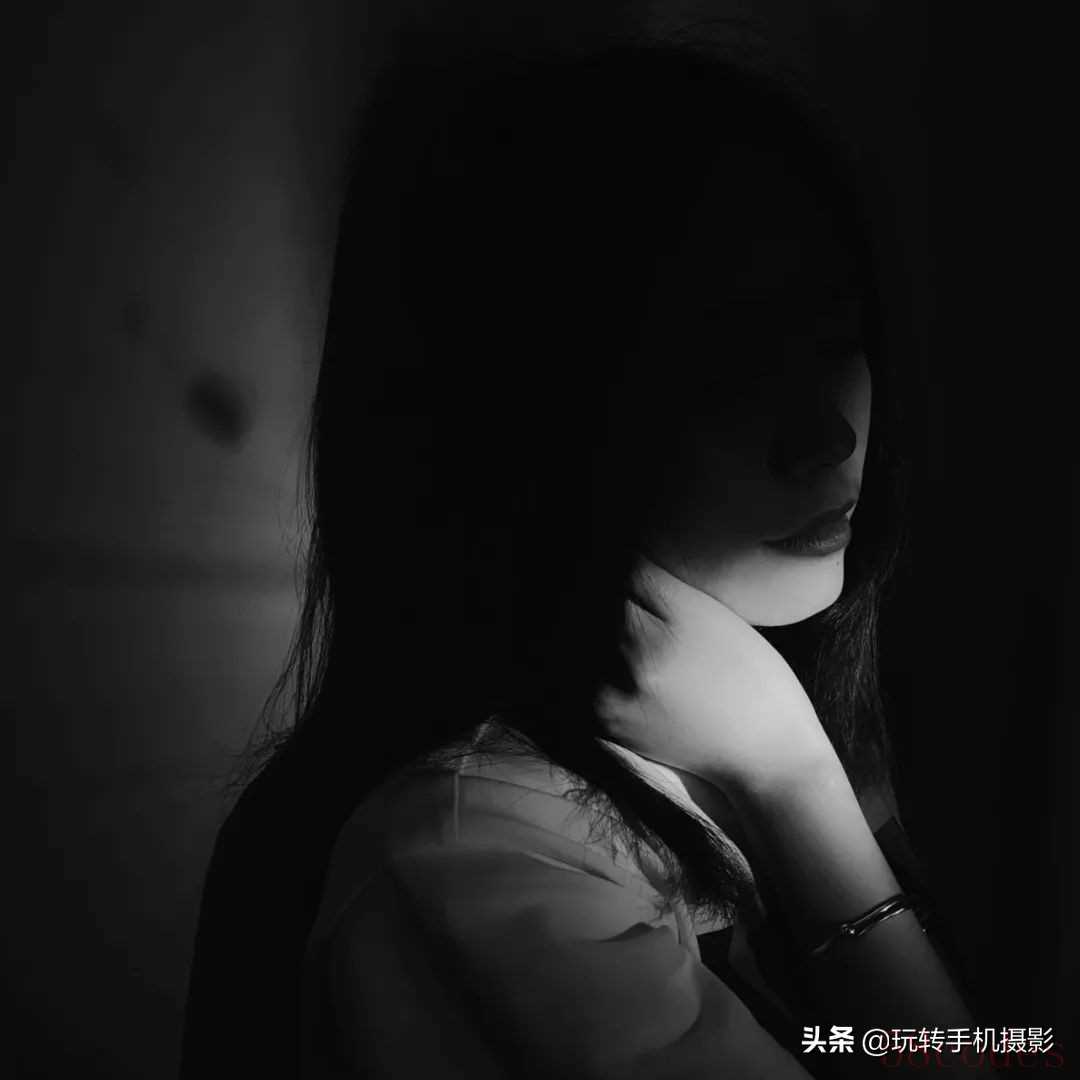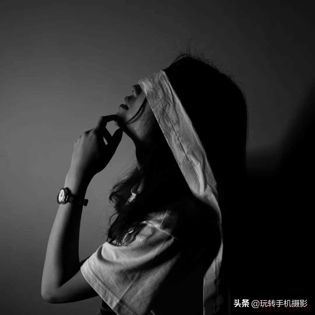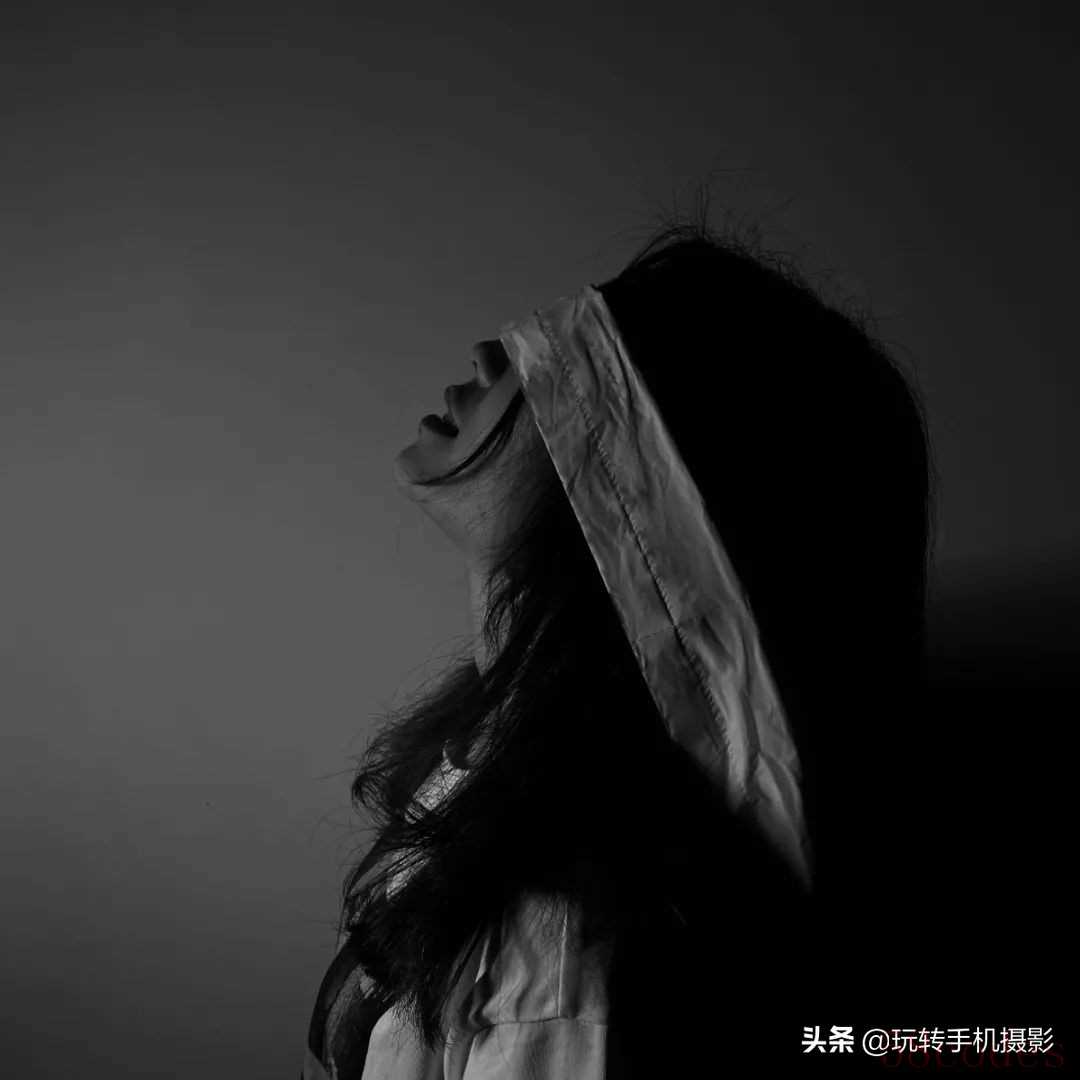 而在正确打光后,你只要将纸巾挡住模特的某个部位,然后利用手机相机自带的黑白滤镜,按下快门即可获得一张高冷情绪的黑白人像照。