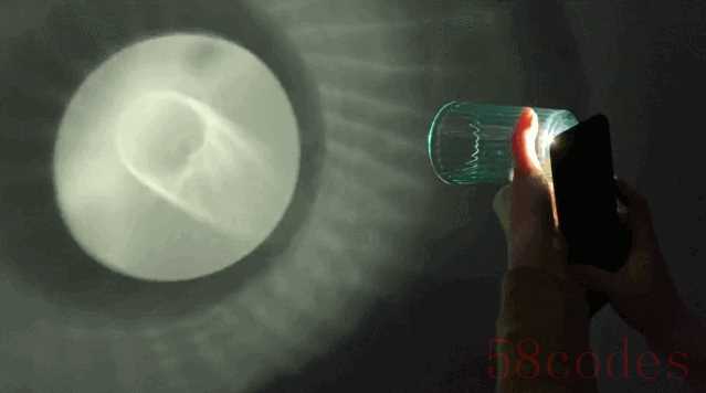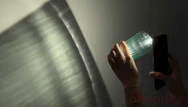 我们日常生活里的水杯,也是很好的拍摄小道具。在没有自然光线照射的室内环境里,手机手电筒的光透过水杯,水杯的投影在白墙上形成波纹效果的画面。