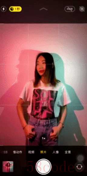 ②接着,点击屏幕拍下第一张实照;③然后,再点击一下屏幕拍下第二张虚照;④最后,按下快门就可以拍出一张具有双重人格的人像照了。