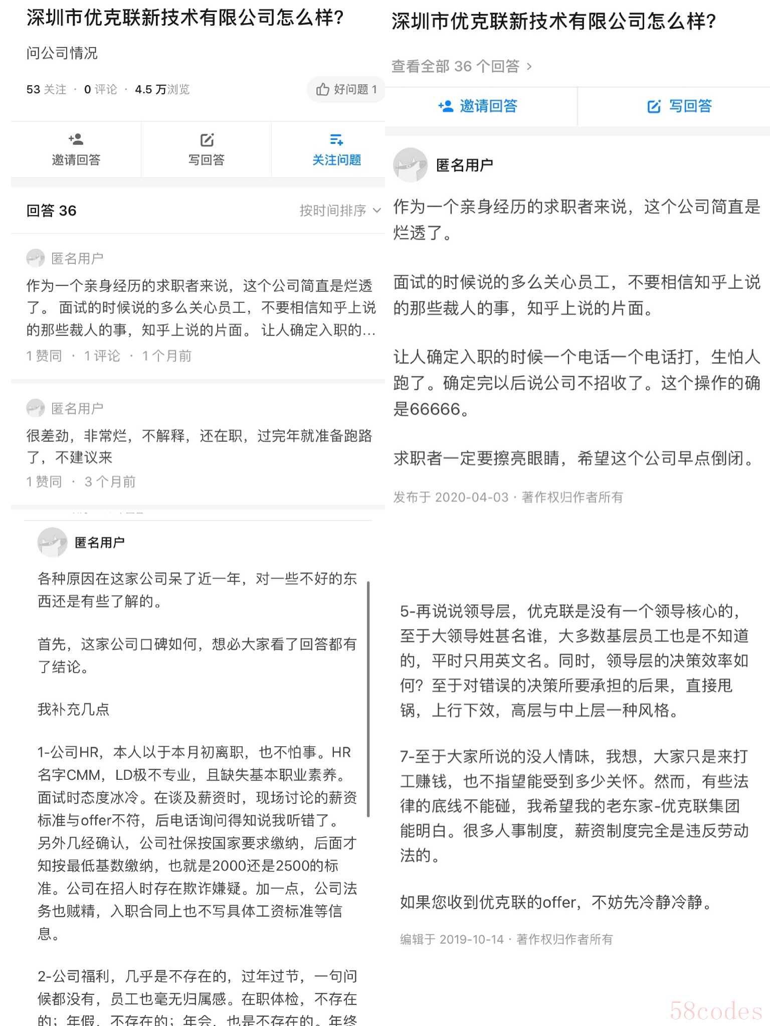 如果说专利问题是优克联的外忧,那么员工对公司现状的不满则是内患。在知乎平台上,一个“深圳市优克联新技术有限公司怎么样?”的问题下涌来许多求职者和现、前员工的吐槽。该问题显示有4.5万人浏览。