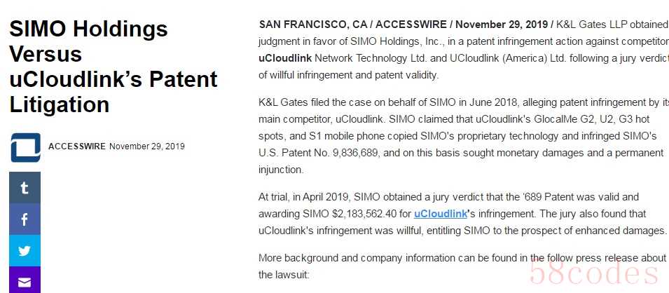 据了解,2018年6月漫游宝向美国法院提起诉讼,指控优克联公司专利侵权。2019年4月,纽约南区法院认定优克联公司型号为GlocalMe G2、G3和U2的WIFI热点设备以及型号为S1的移动电话侵犯了漫游宝公司的US9,736,689专利权,判令优克联公司赔偿218万美元(约合人民币1523万)。