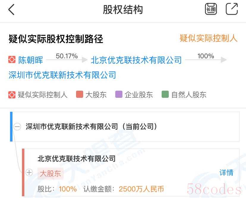 公开资料显示,优克联成立于2014年,是全球第一家移动数据流量共享平台。目前公司旗下有“吉客猫”和“漫游超人”两大品牌,分别对应销售和租赁两种不同的模式。换句话说,优克联的主要业务可以概括为 “手机自带流量,全球范围内零漫游”。另据天眼查股权结构显示,优克联 CEO陈朝晖疑似公司实际控制人,持股50.17%.