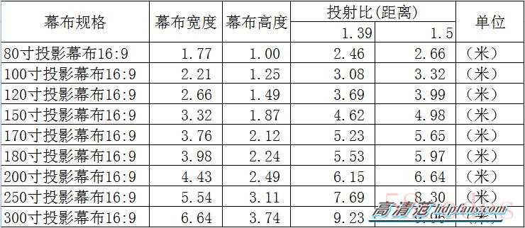 | 投影距离 (米) | 投影尺寸 (米) | 建议投影画面比例 (16:9) | 备注 |