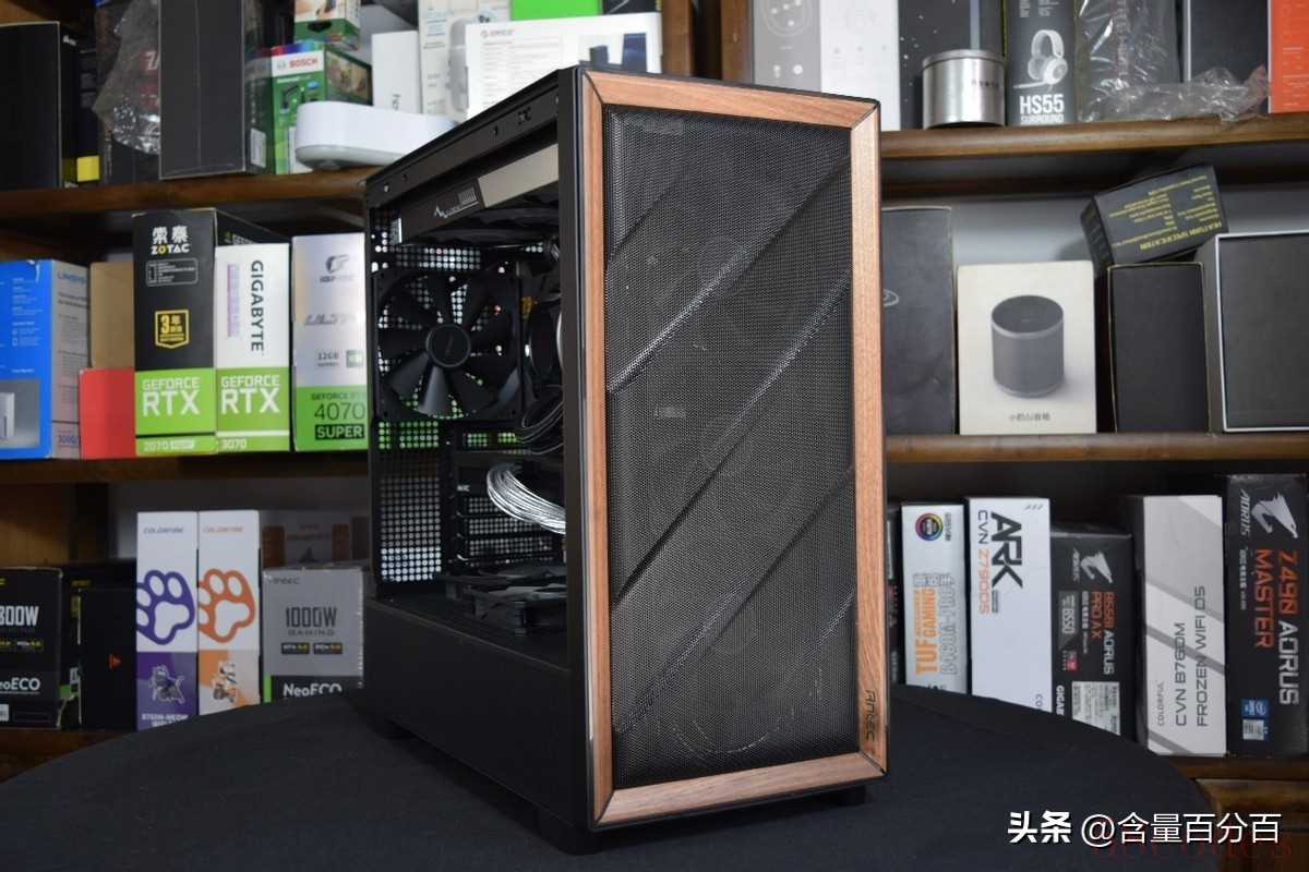 另外前面板四周加入了木材设计来提升质感和视觉观感,同时还自带5把无光风扇,即前置3把12厘米风扇、后置1把14厘米风扇以及底部1把12厘米反向风扇,免去了另购风扇的麻烦,无光设计的风扇也更适合不喜欢光污染的用户。