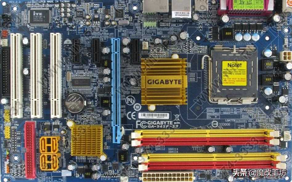 历史以来,MADE IN TAIWAN的GA主板,一直都用料豪华,据说连售后质保也更加周到。第二张图中的绿色固态电容,基本在MADE IN CHINA的GA主板上就没有出现过!而第一张图的945P-S3主板,MADE IN CHINA的也出现过各种电容的版本,最差的当然是那个紫色的TK爆浆大王牌了。