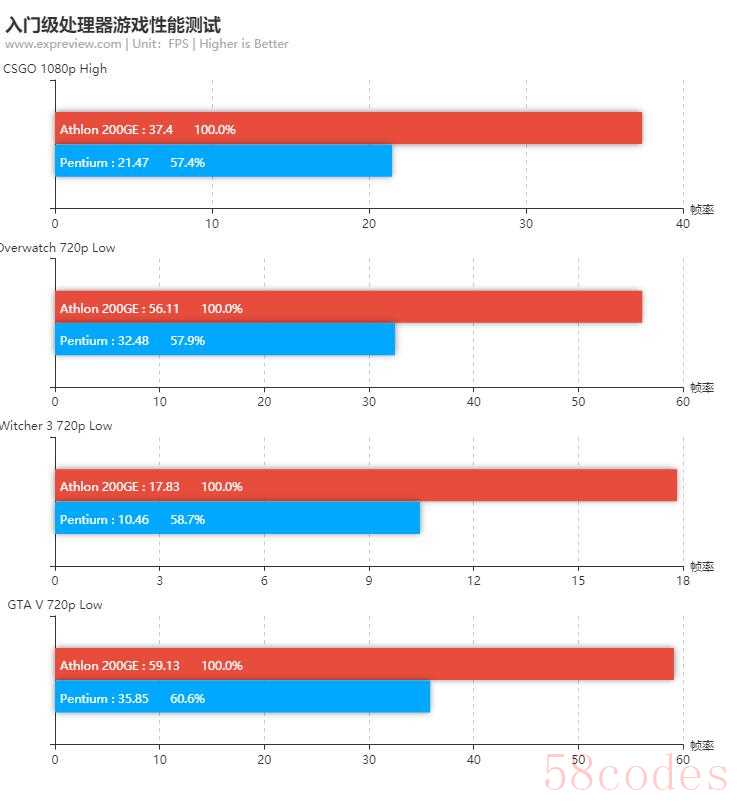 游戏测试依然如此,在我们测试的《反恐精英:全球攻势》、《守望先锋》、《巫师3:狂猎》、《侠盗猎车手V》四款游戏当中,都可以看到很明显的差距,换算成百分比都是40%左右,这在帧率上体现出的就是很大的体验差距,比如说《守望先锋》,在720p分辨率、百分百材质渲染、低画质的时候速龙200GE依然有接近60FPS的体验,相当流畅,但是奔腾G4560的帧率就仅仅是30FPS出头。